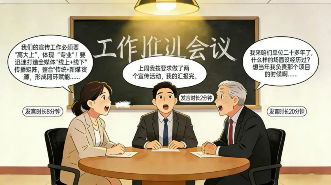有一张会议现场图,图片内容:1.老盘提出宣传要高大上,要体现专业性,打造“线上+线下”的宣传矩阵,整合传统+新媒体资源,形成闭环赋能……使用很多专业名词,发言时长8分钟;2.见君表示之前办过两个活动……仅简单概述,发言时长2分钟;3.余思君谈及自己来单位二十多年,负责的项目连续三年拿第一,团队无人不服……主要讲述自己过去的经历与成绩,发言时长20分钟。