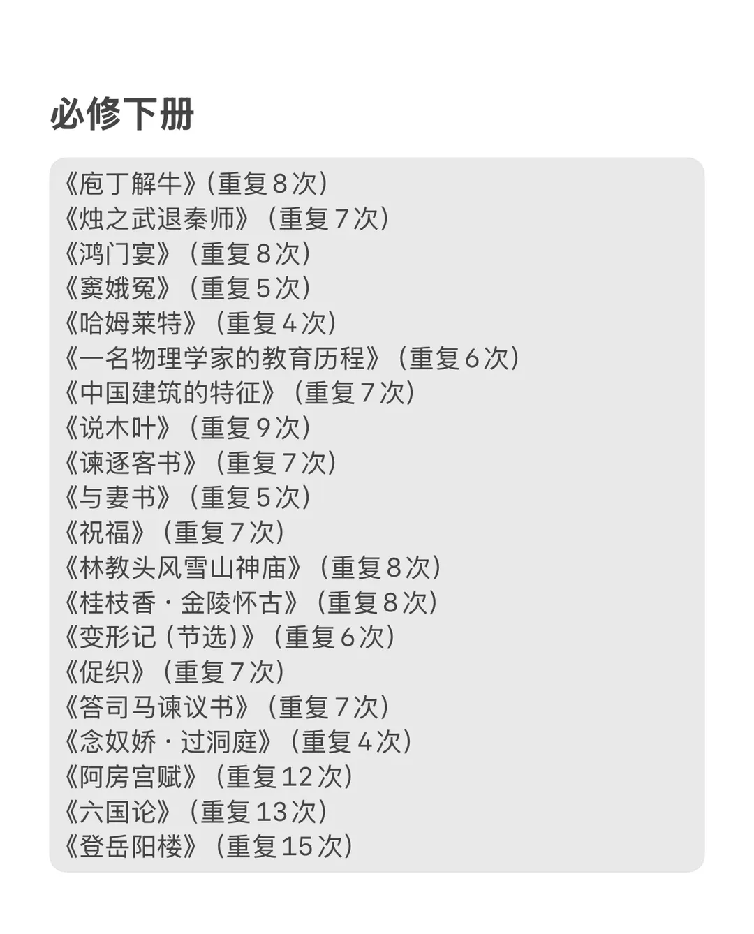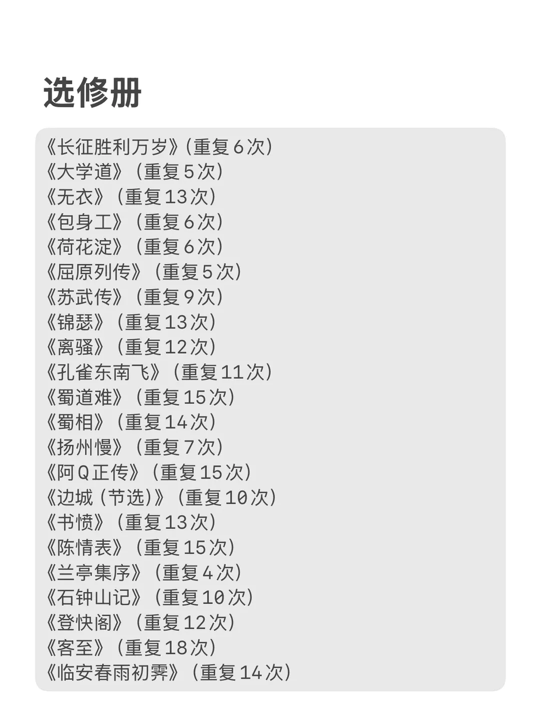 篇目精华:精选62篇高中常考课文,必修和选修教材热门常考试讲篇目。