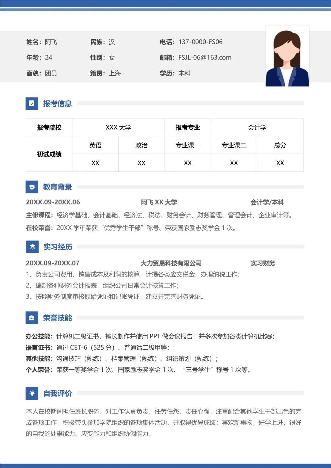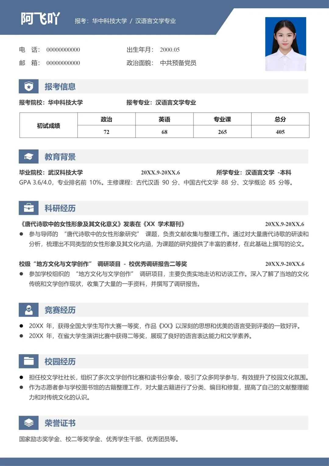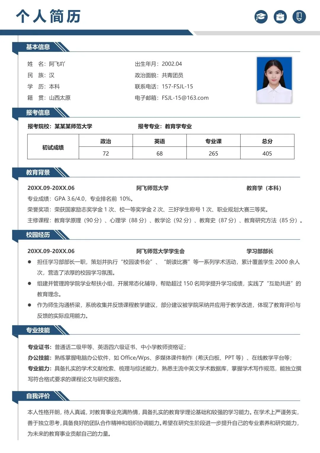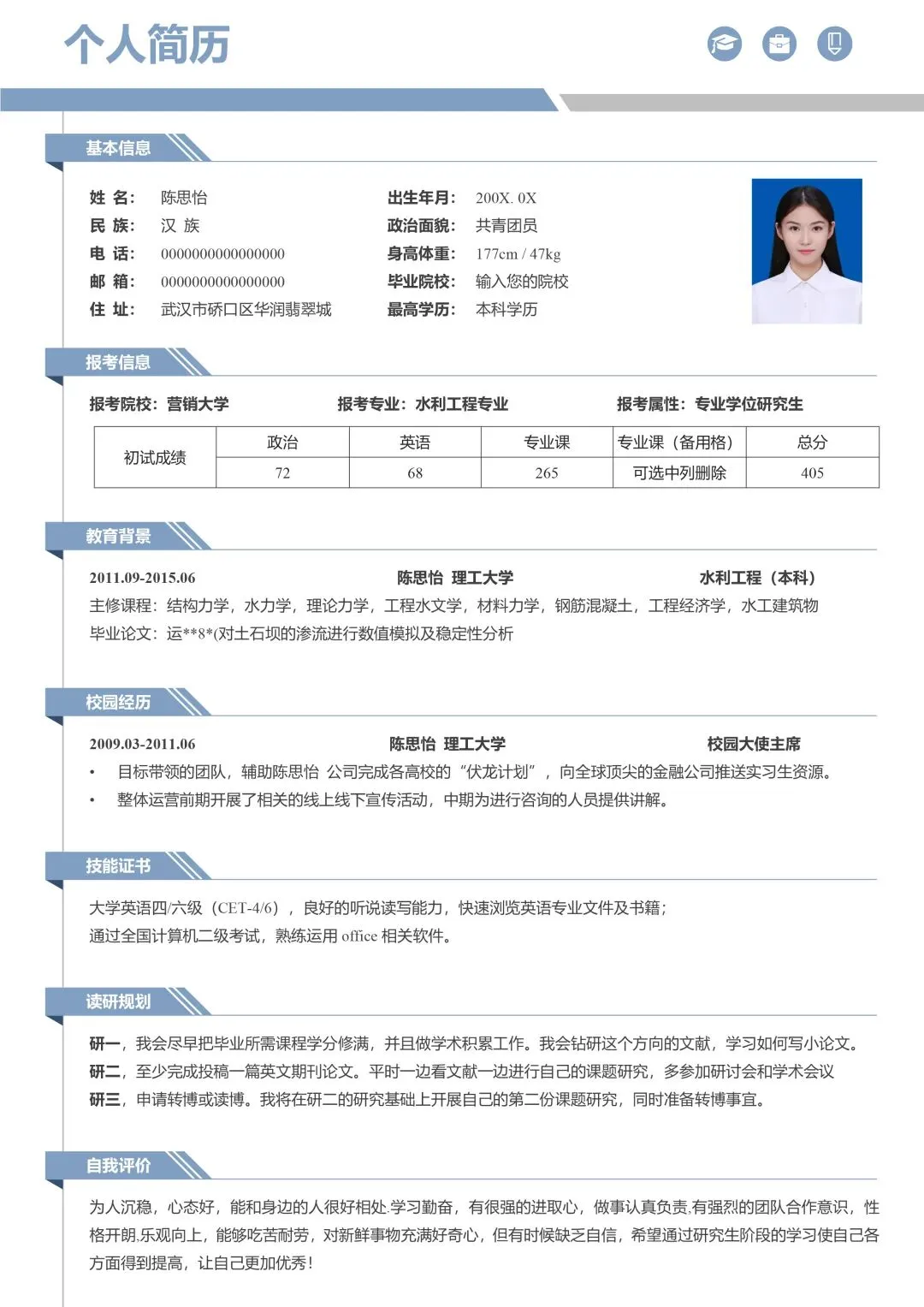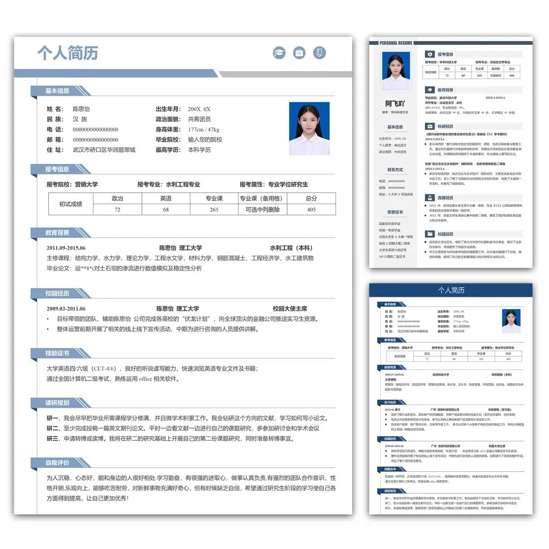 导师超喜欢的研究生考研复试面试个人简历模板原来长这样,各位即将参加26届研究生复试面试的小伙伴们看过来,临近复试面试,如果你还不没有准备好面试简历?不知道什么样的面试简历能赢得心仪导师的青睐?别担心,这份简约蓝色单页研究生考研复试通用简历模板来了,有了它,你只需要简单修改模板内容即可轻轻松松写出令导师一眼就看中的优秀复试个人简历,一举帮你拿下复试面试,助你成功上岸
