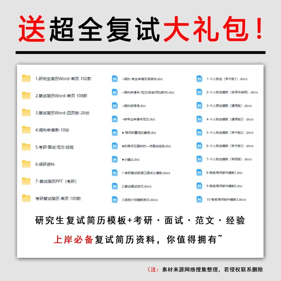 别把复试面试简历当成“可有可无”的材料。复试现场,一份清晰有力的简历,往往就是你的加分入口。它能帮你做到以下三件事:1、快速建立印象:导师在有限时间内迅速了解你的背景与优势2、引导提问方向:简历上展示自己熟悉的内容,把导师的面试话题拉到你熟悉、擅长的经历上,这样面试才能掌握主动权3、细节决定成败:避免被动失分,别人都有准备简历而你没有,容易显得准备不足,无论院校是否强制要求,建议人手备一份复试简历,以备不时只需。最后,我想说:在准备复试的过程中,一份优秀的复试简历是必不可少的,好的复试简历能帮助你在众多竞争者中脱颖而出,成为导师眼中的亮点。在此我祝愿所有的小伙伴都能得偿所愿,成功上岸!