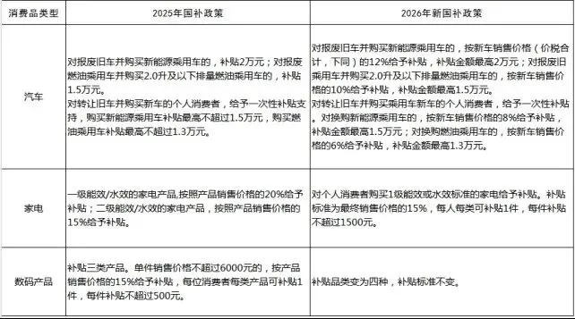 当前,国家围绕促进消费、优化产业结构,持续推出“新旧政策迭代”相关举措。现有一份政策对比表,详细列出了汽车、家电、数码智能产品三大类消费品的旧政策与新政策,包括补贴标准、适用范围、申领条件、优惠力度等内容。