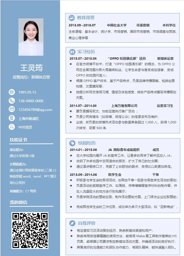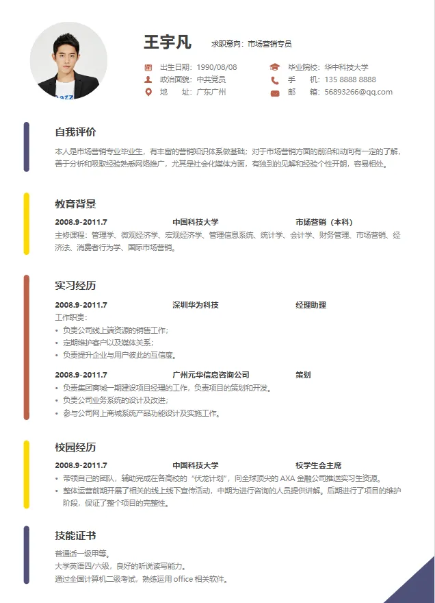 色彩明快、排版灵动,青春活力感拉满,适合新媒体、设计、互联网运营等创意类岗位。模板预留创意作品展示区,个性与才华一眼看得见。