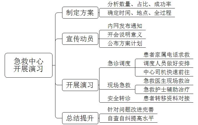 首先,做好急救演习前的数据总结和方案制定等工作。第一,查阅急救中心过往急救记录,总结急救情况的类型、数目、占比、急救成功率以及对应请求时间、地点等数据,作为急救演习方案依据。第二,制定演习方案。确认演习的时间、地点、病种和流程。依据过往数据,时间上选择急救请求较少的时间段。事故地点要兼顾城市主干道、拥堵路段和偏远路段,以更加深入、真实考察急救时间和工作细节。病种选择急救数目多、占比高以及成功率有待提高的急救种类,完整地模拟急救流程。