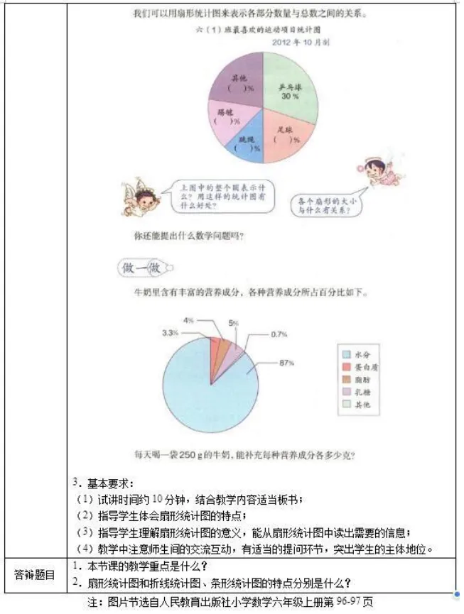 本节课的教学重点是扇形统计图的认识。通过本节课的学习,学生要认识到扇形 统计图能够直观反映部分占总体的百分比,整个圆表示总体,圆内各个扇形表示 各部分,并且扇形的大小能够反映各部分在总体中的占比多少。