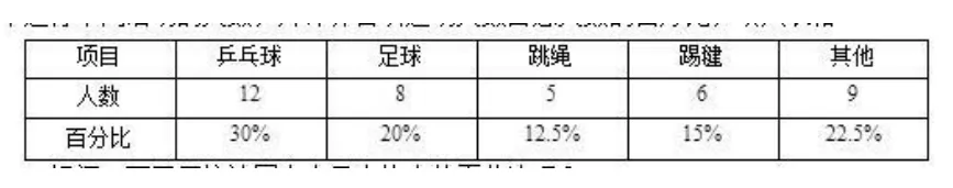 预设:占比最高的项目是乒乓球;喜欢乒乓球和足球运动的人数占总人数的一半; 喜欢足球运动的比喜欢跳绳运动的多 7.5%等等。