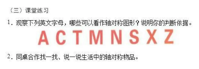 课堂练习我设置了两个题目,第一题展示学生熟悉的英文字母,让学生根据轴对 称图形的概念判断字母中哪些可以看作轴对称图形,此题目是对本节课知识的直 接练习。第二题让同桌合作找一找生活中的轴对称图形,让学生将数学知识与实 际生活相结合,增强应用意识。
