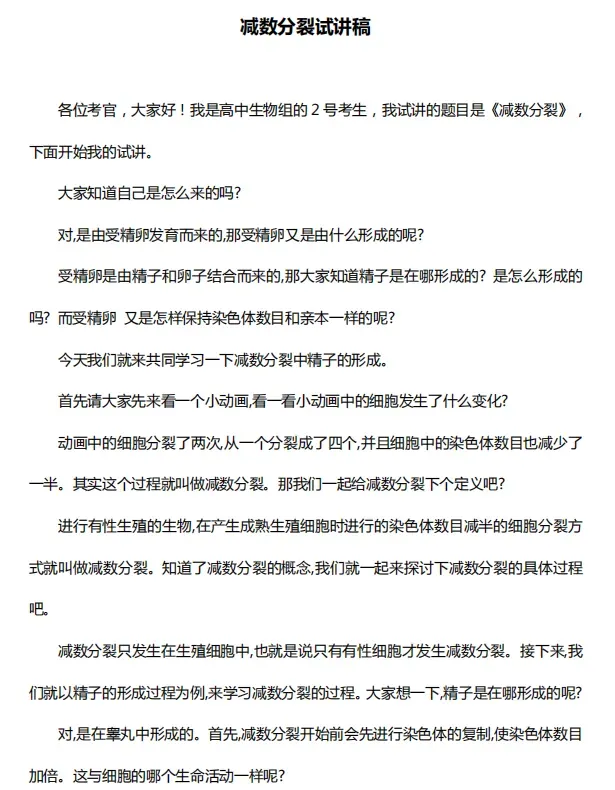 各位考官,大家好!我是高中生物组的 2 号考生,我试讲的题目是《减数分裂》,下面开始我的试讲。