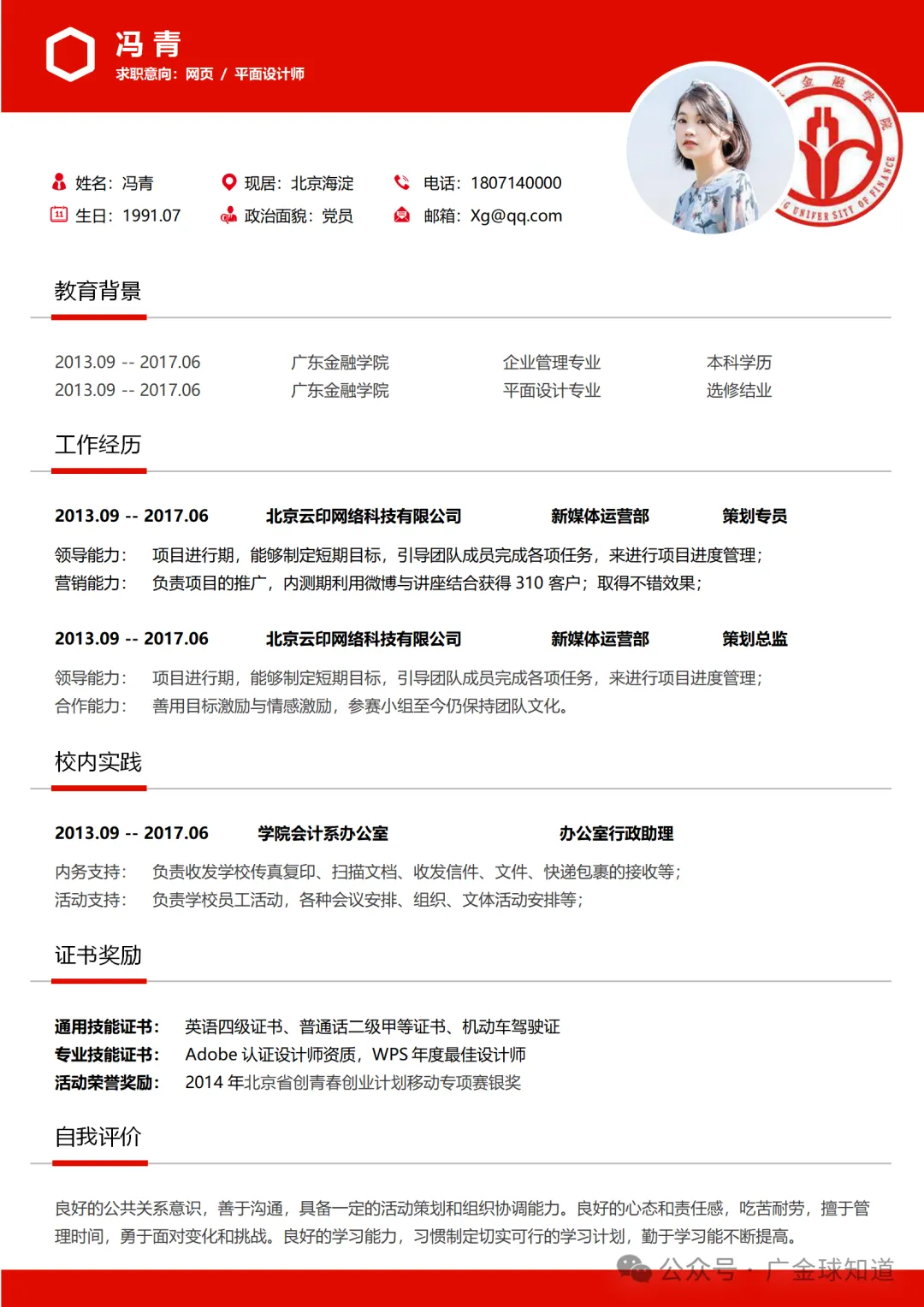 广东金融学院简历模板来啦~