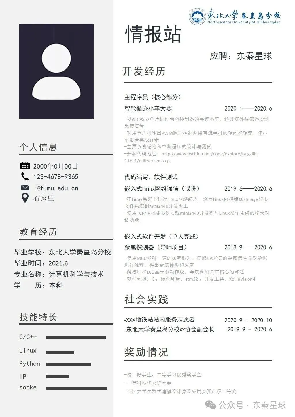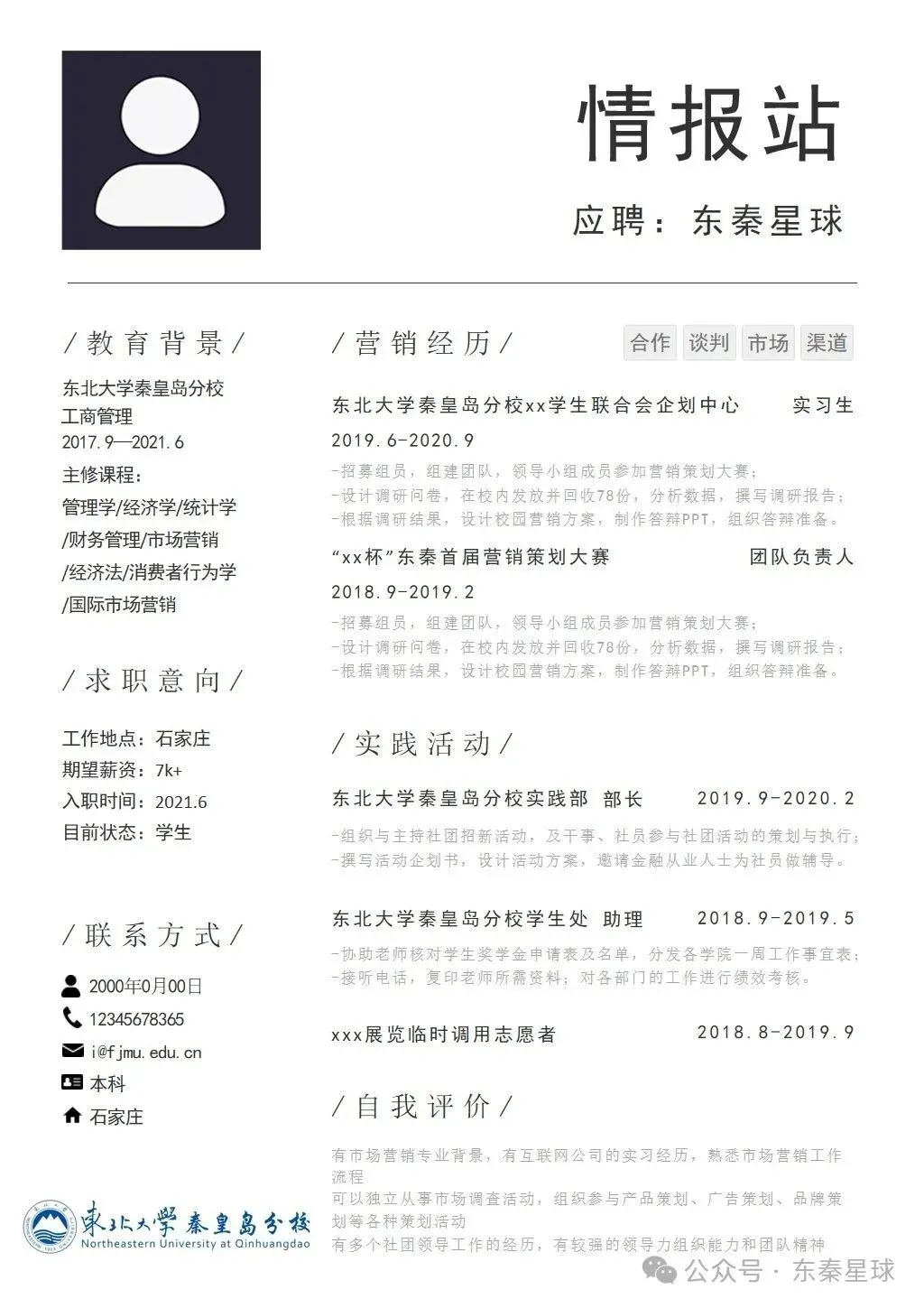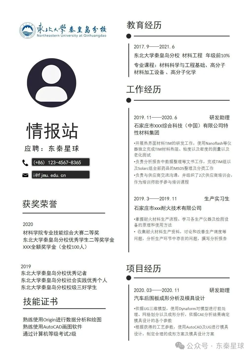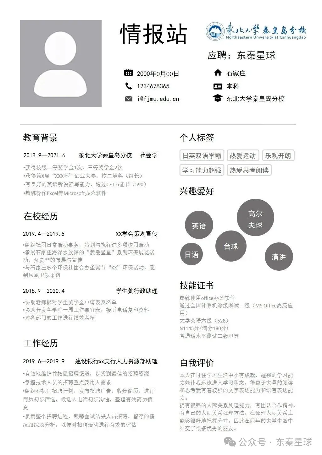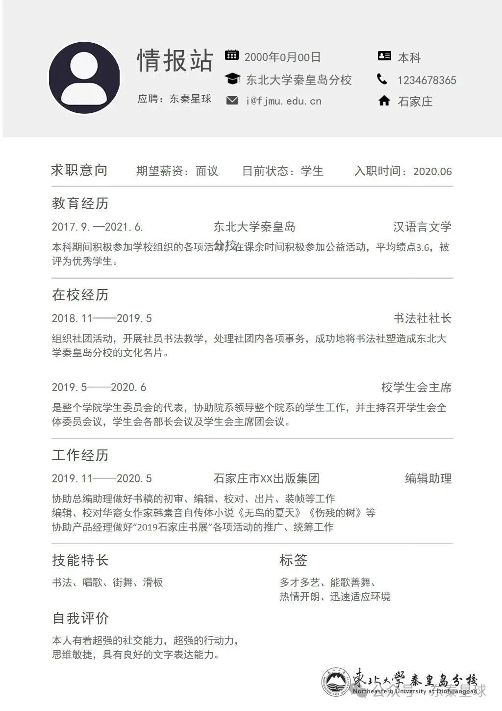 东北大学(秦皇岛)专属简历模板