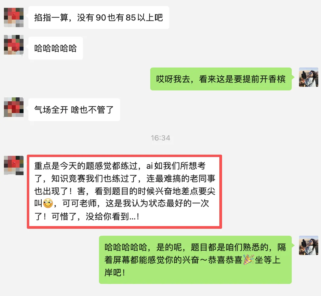 我们收到了大量学员的积极反馈。这不仅是对同学们备考成果的检验,更是对我们整个教研团队专业实力的最好印证。看到大家自信满满的状态,我们知道,那些日夜兼程的打磨与沉淀,在这一刻都有了回报!!!
