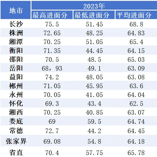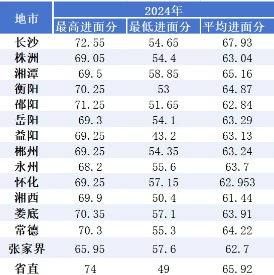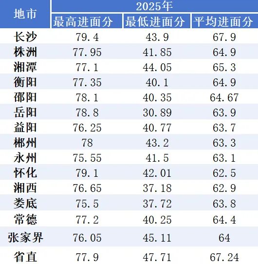 ✅ 长沙:平均进面分稳居首位,2025 年平均 67.9 分,竞争最激烈!✅ 省直:分数仅次于长沙,2025 年平均 67.24 分,岗位含金量高✅ 地市差异:湘西、娄底最低进面分偏低(37+),但平均分仍在 62-63 区间✅ 趋势变化:2025 年部分地市最低进面分有所下降,但高分段依然卷到 79+