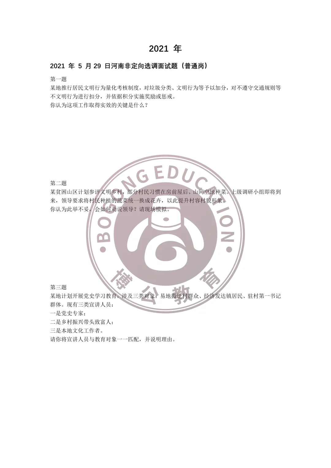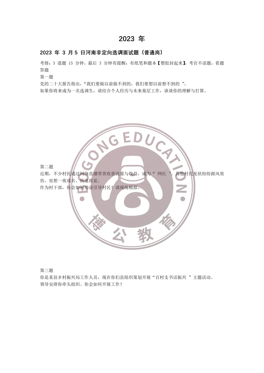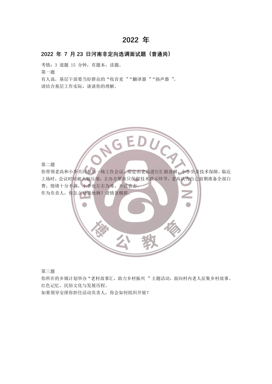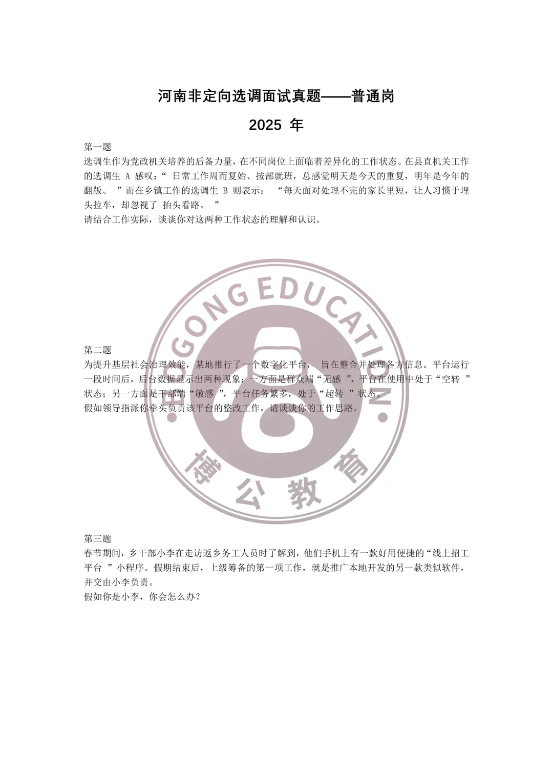河南普通选调(非定向)往年面试真题—普通岗