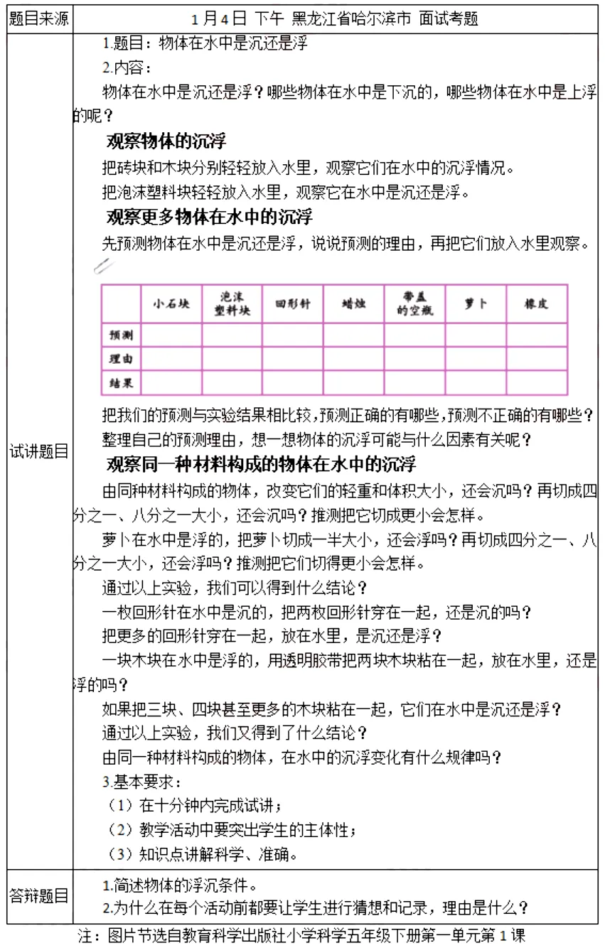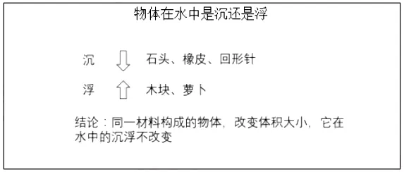 ③结合上述两个实验,学生总结结论,教师补充:由同一材料构成的物体,改变它们的体积大小,它在水中的沉浮不改变。
