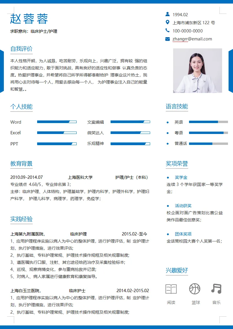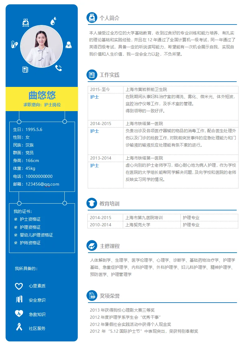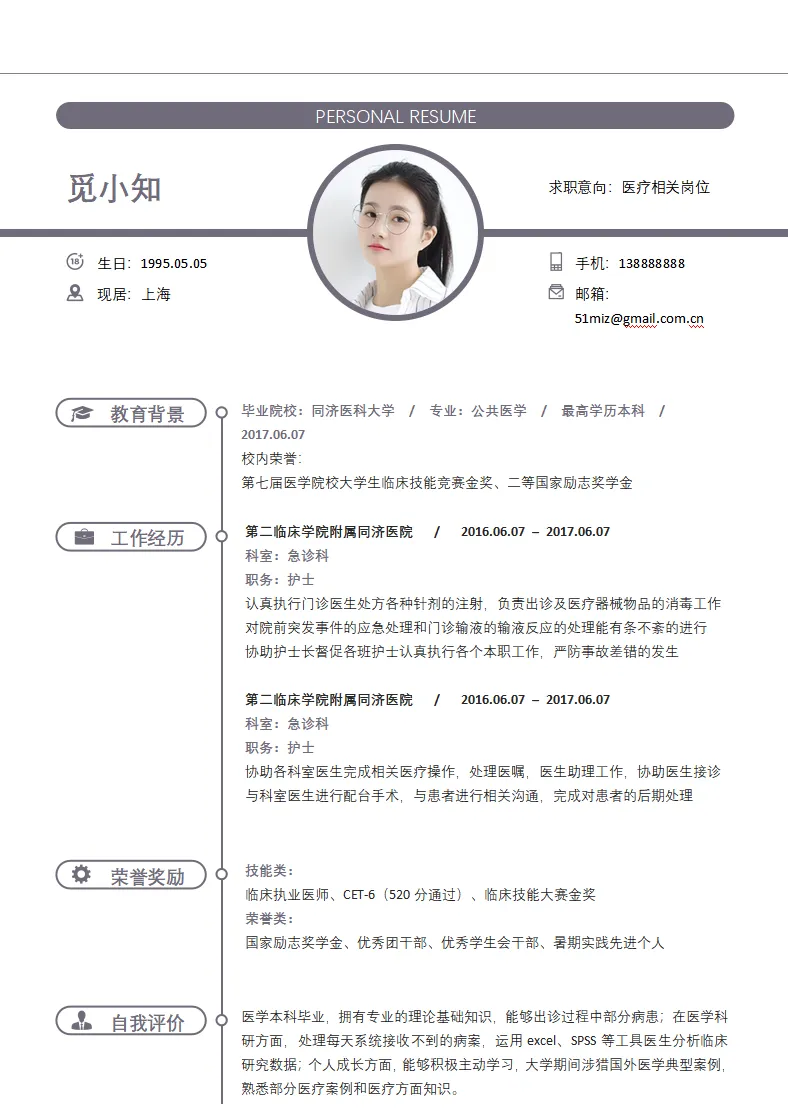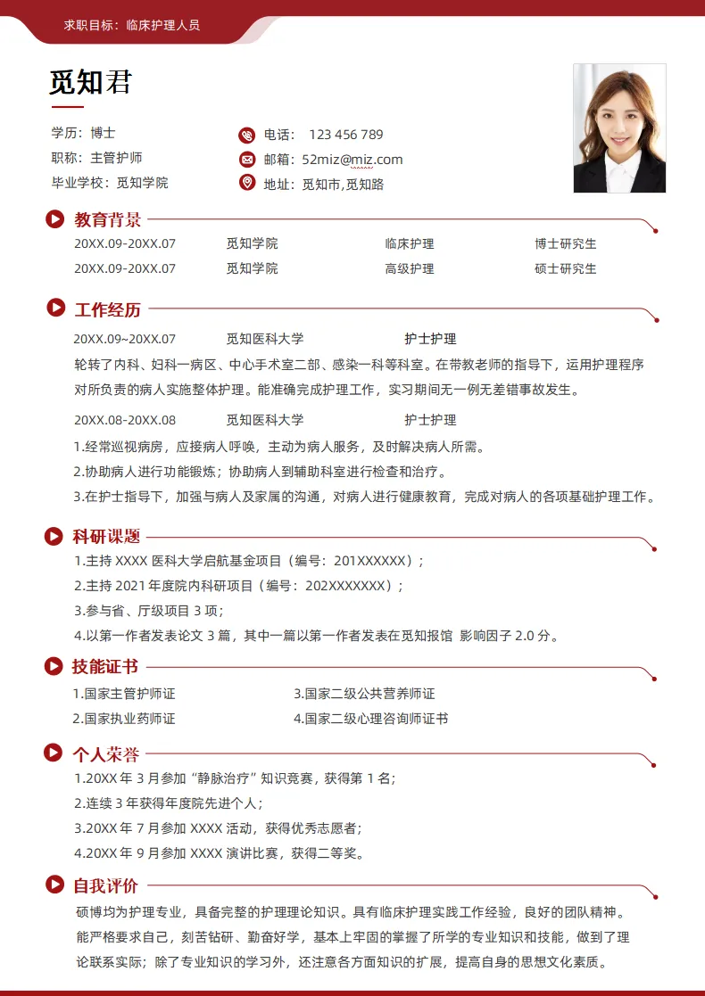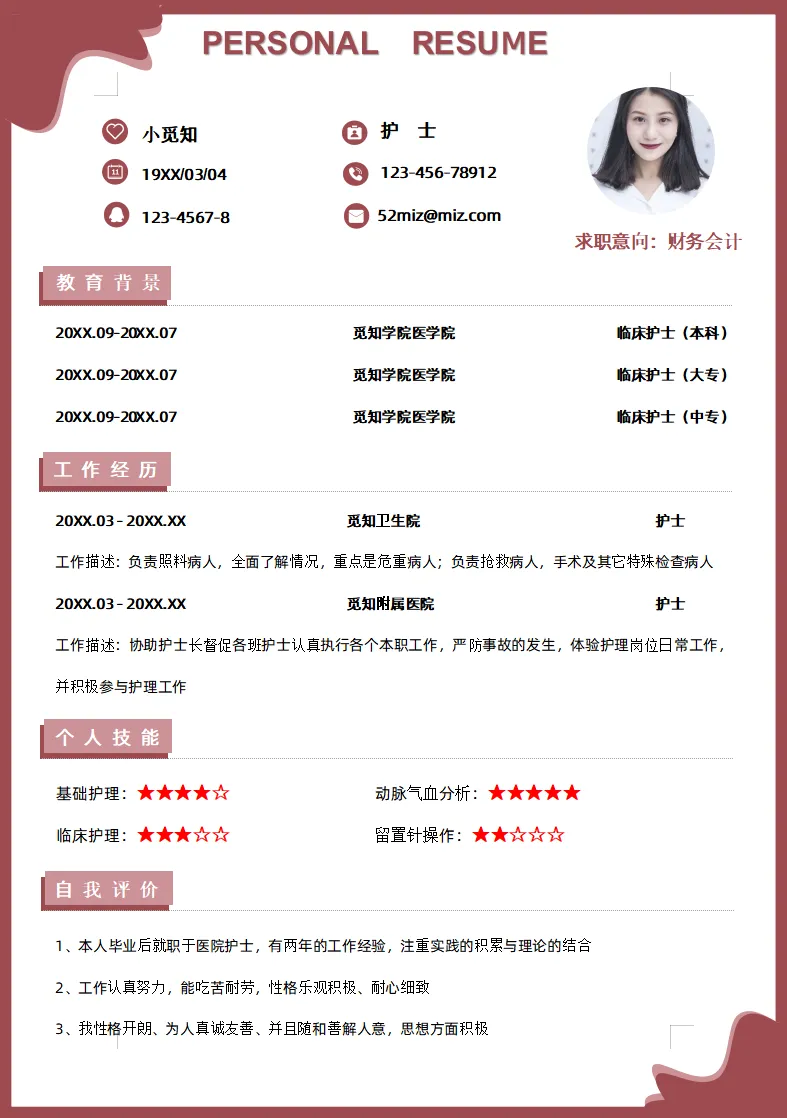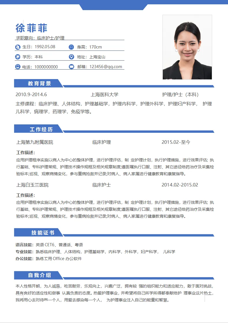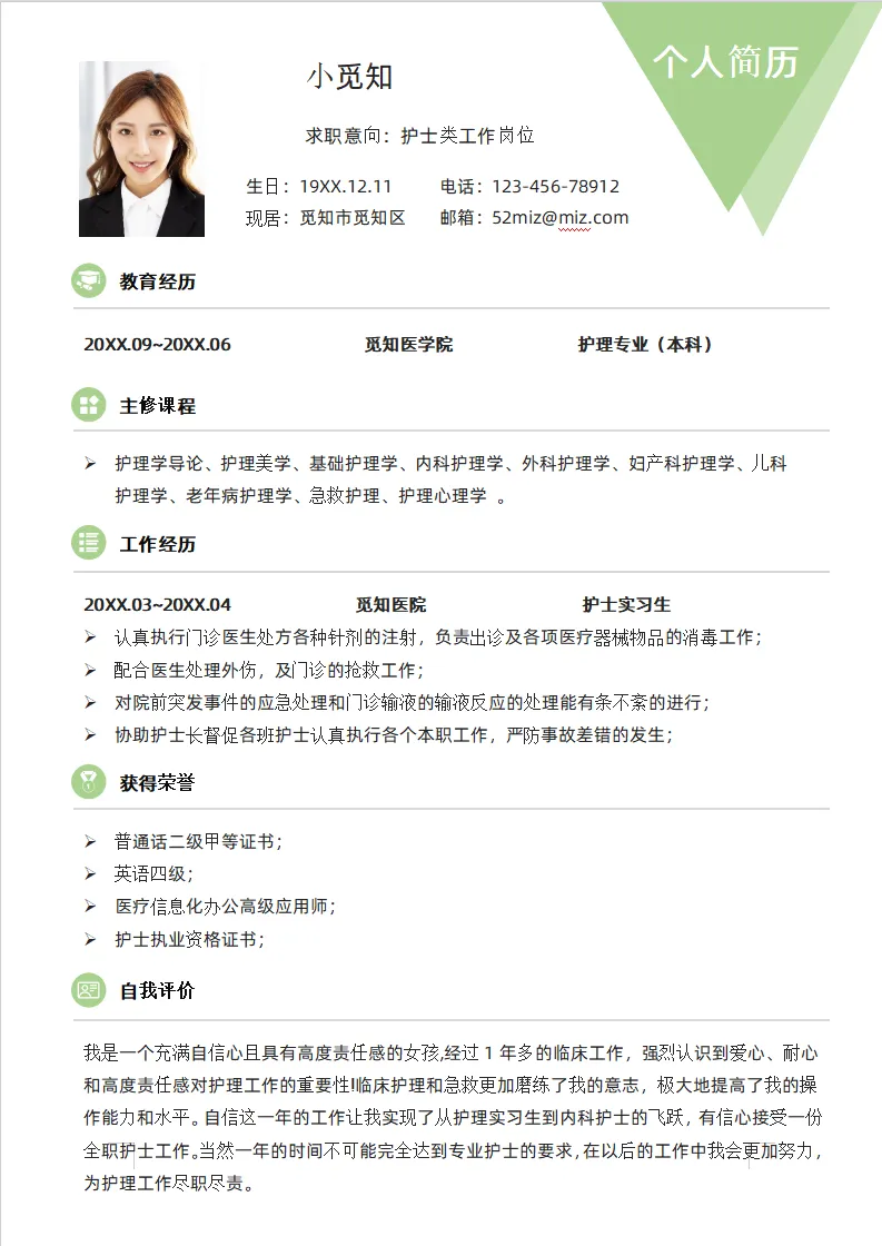 不仅大学生可用,实习生、毕业生也都适用,护理、护士、医学等专业都通用,都是Word格式的,下载后即可编辑打印,最后祝各位同学都能找到合心意的工作~