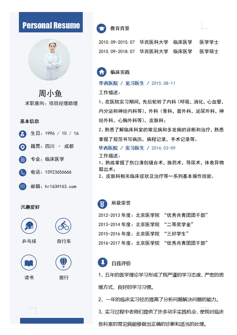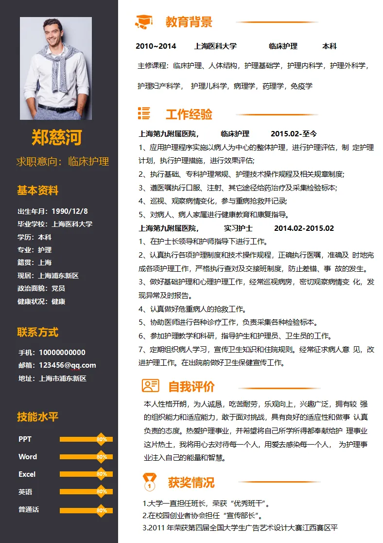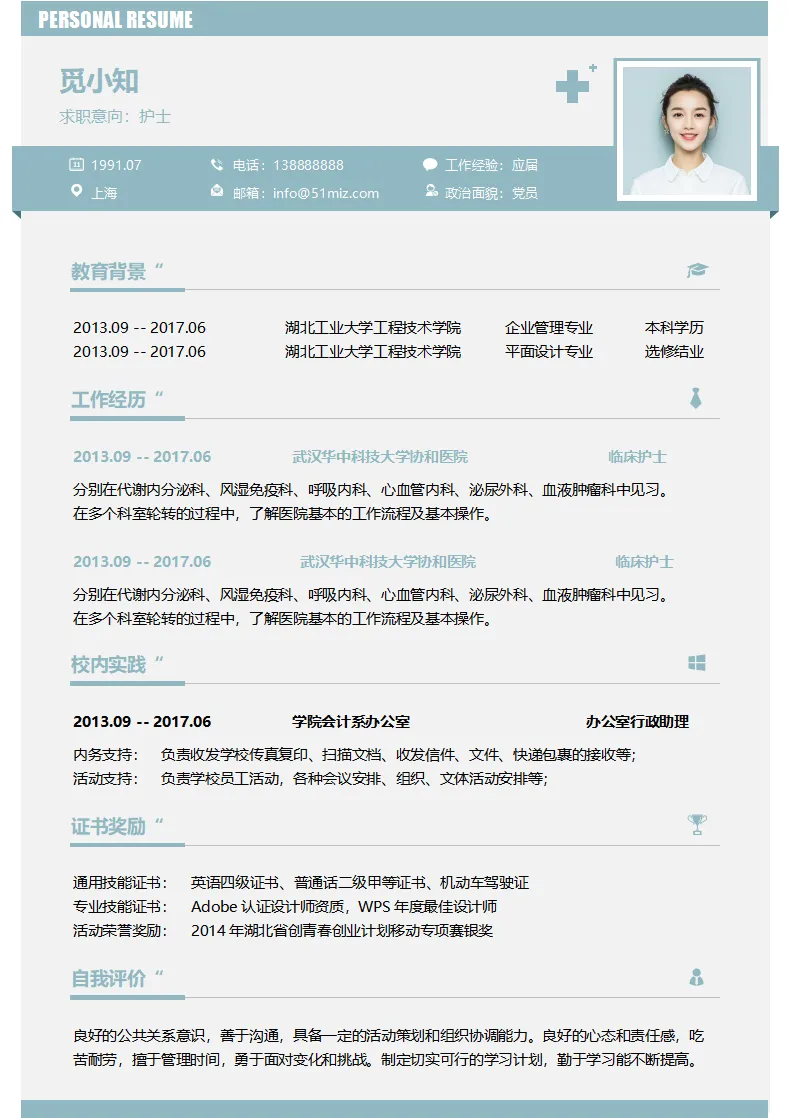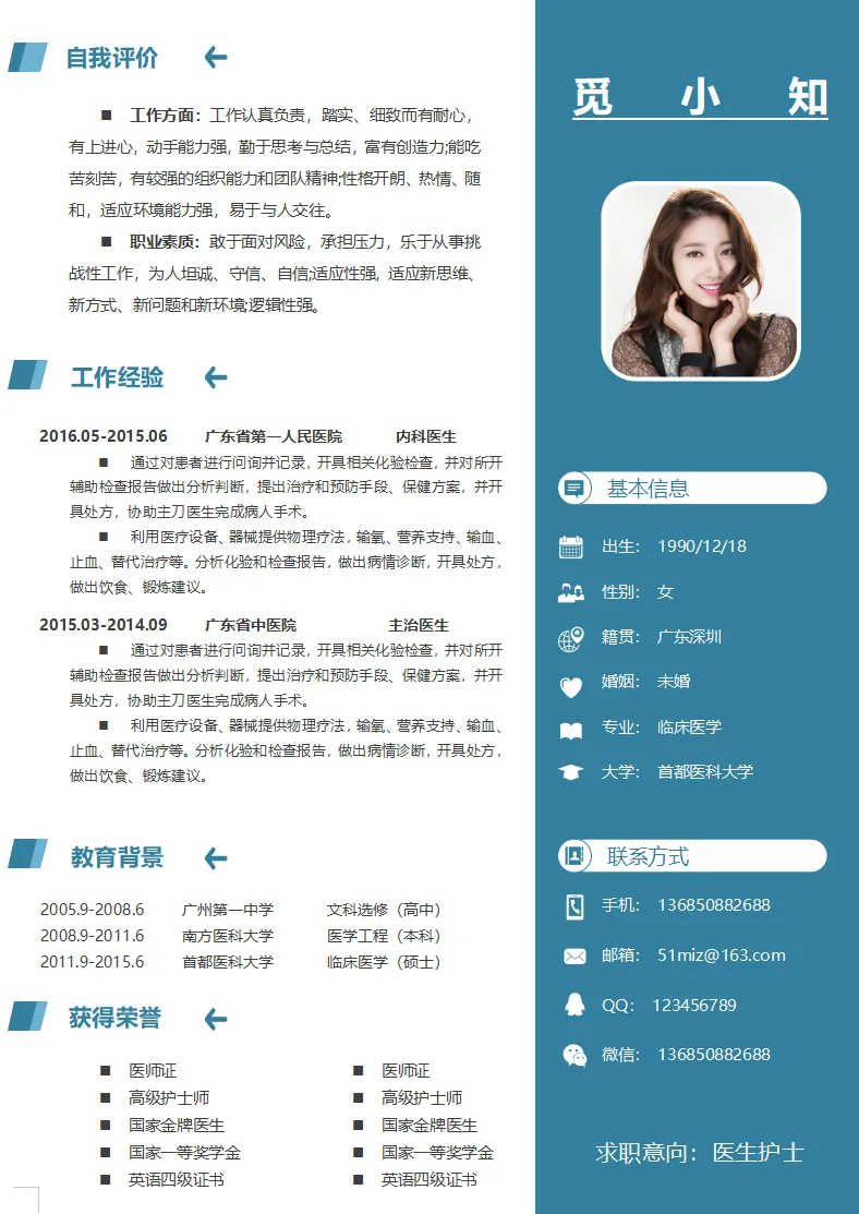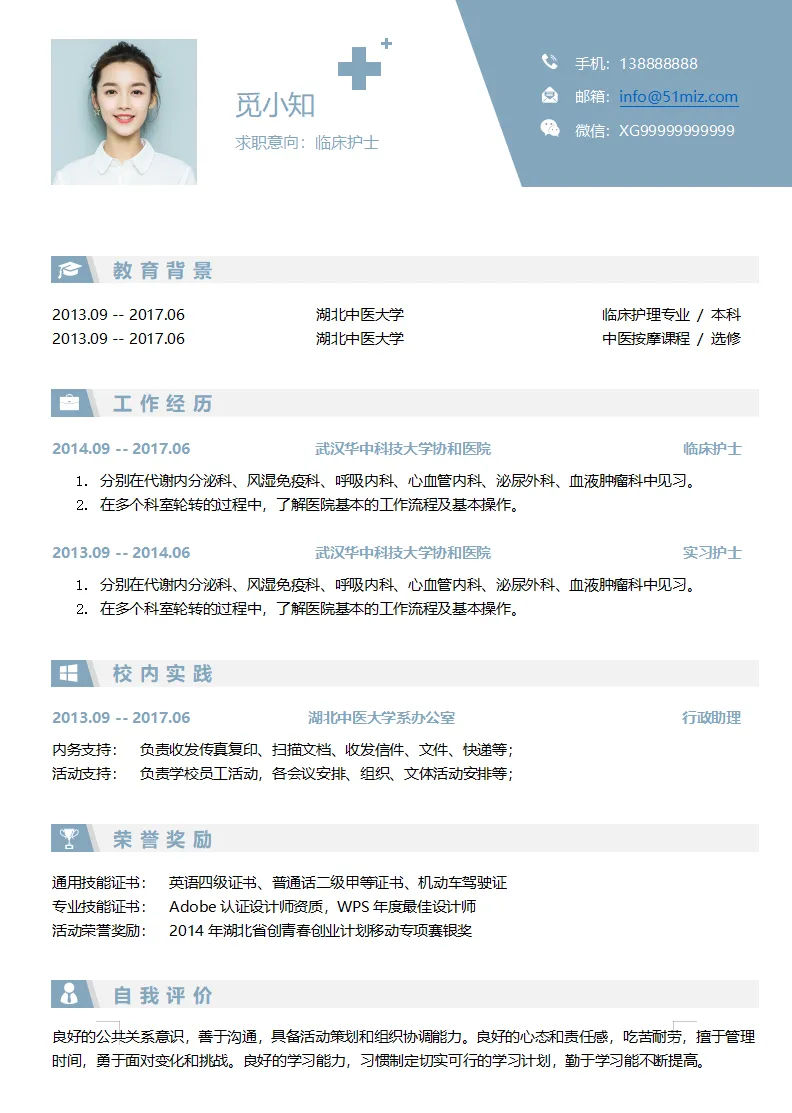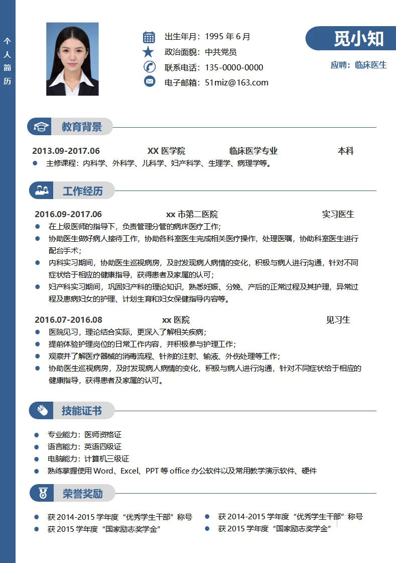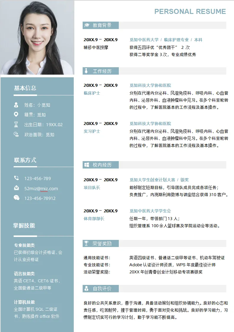 不仅大学生可用,实习生、毕业生也都适用,护理、护士、医学等专业都通用,都是Word格式的,下载后即可编辑打印,最后祝各位同学都能找到合心意的工作~