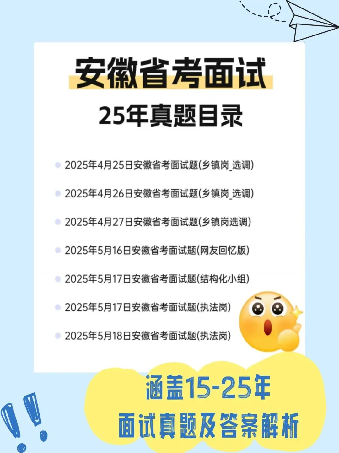 完整收录 2015-2025 年安徽省考面试真题,2025 年 4-5 月乡镇岗、选调、执法岗等最新网友回忆版真题全部纳入,紧跟考情趋势,让你精准把握最新命题方向。