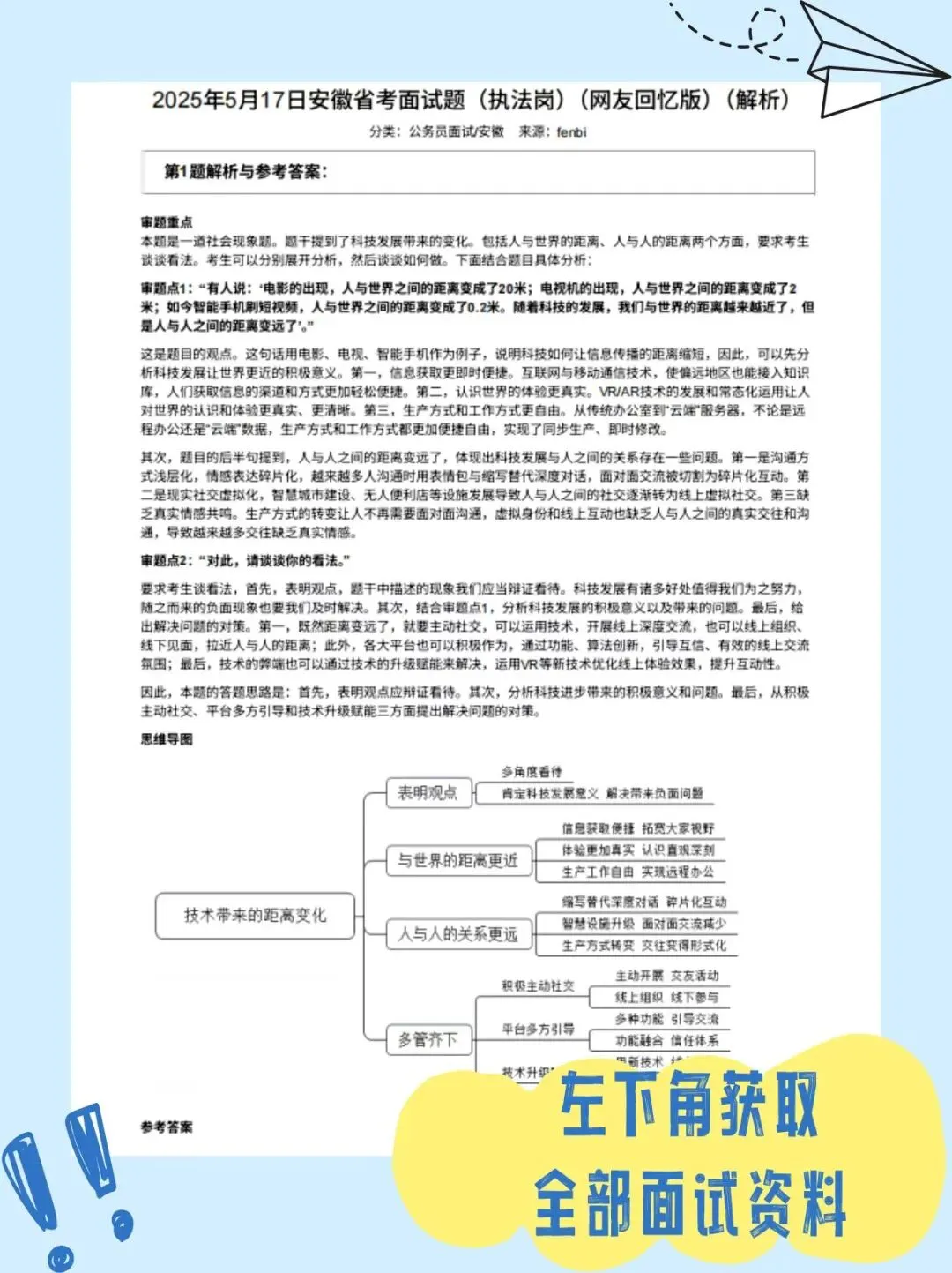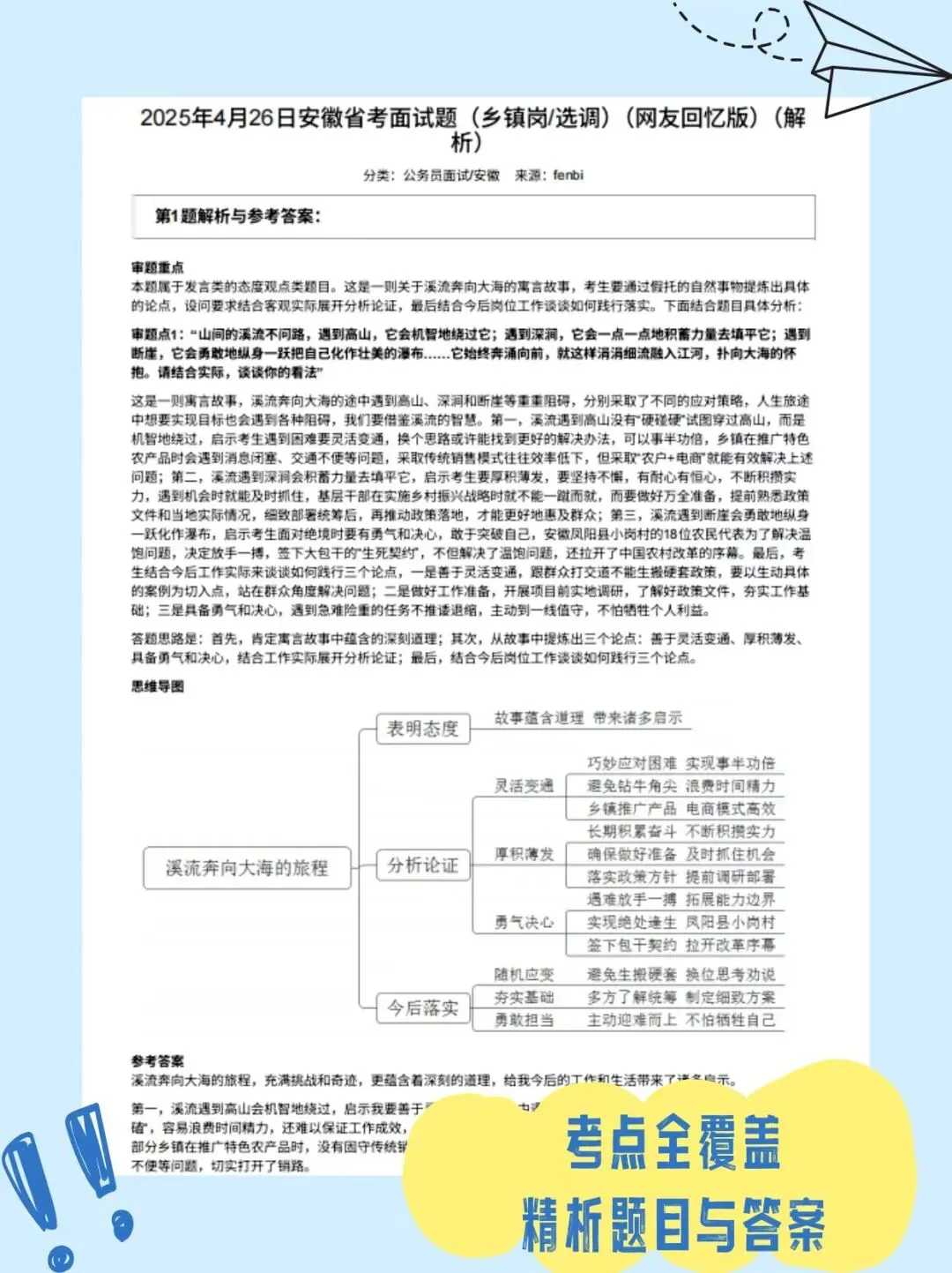 以 2025 年 4 月 26 日乡镇岗 / 选调真题为例,资料不仅还原题目,更从审题重点入手,分析寓言故事背后的核心逻辑;通过思维导图梳理 “表明态度 - 分析论证 - 今后落实” 的答题思路;最终给出完整参考答案,结合岗位实际给出落地建议,让你不仅知其然,更知其所以然。