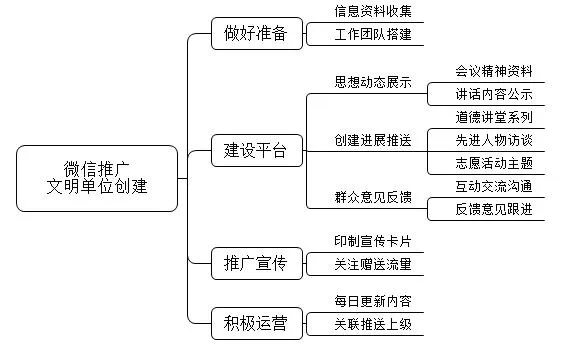 第二,联系专业技术人员,搭建微信平台。将我们单位的文明创建微信公众号划分为思想动态、创建进展和群众反馈三大板块。思想动态板块主要用来展示十八大、十九大会议精神和领导人系列讲话精神等,充分展示单位的文明和进步。创建进展板块主要是反映一系列的单位文明创建活动,比如其中道德讲堂活动可以邀请单位内德高望重的老同志和退休老干部为我们讲述弘扬传统美德的故事,先进人物活动可以展示单位内部敬业奉献、勇于承担等优秀典范,志愿活动可以展示我单位到对口帮扶村和居民送爱心等活动。群众反馈板块主要是与群众进行互动交流,了解群众对于创建工作的满意程度和意见,以便随时调整工作方式。