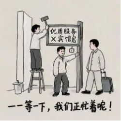 3、结合漫画谈理解:左边图宾馆里面正在凿墙。中间图宾馆外边写着优质服务右边图一个人拉着行李箱进去的时候服务员对他喊:我们正在忙。