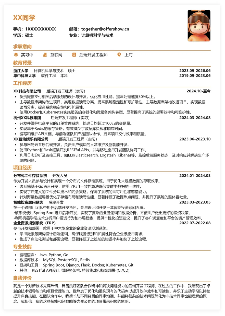 推荐理由:本硕专业与岗位方向高度契合,多段实习经历,对项目内容及产出描述清晰有重点,具备明确的量化指标与数据展示。优质简历在手,助力斩获转正实习offer!