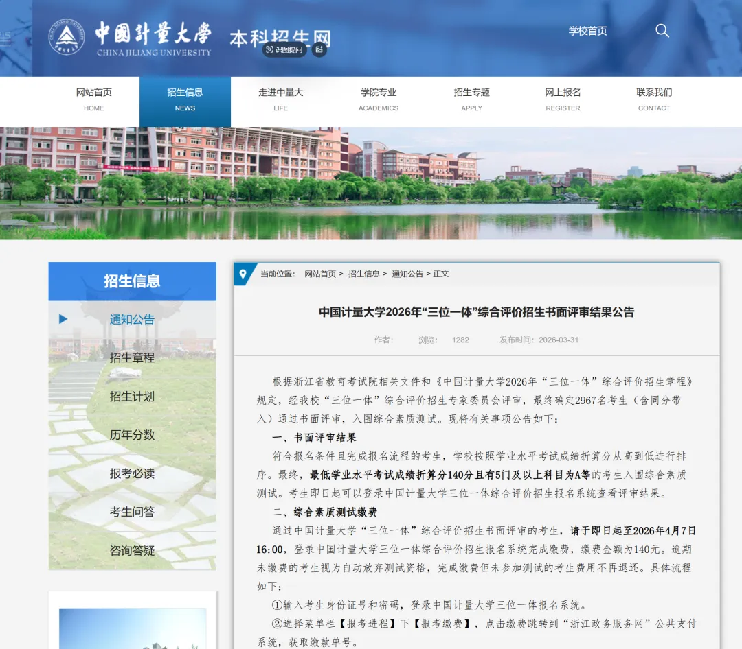 公布与查询:2026 年 3 月 31 日已正式公布书面评审(初审)结果,考生可登录中国计量大学本科招生网(http://zs.cjlu.edu.cn)的 “三位一体” 报名系统,输入身份证号和密码,即可查询个人评审结果。