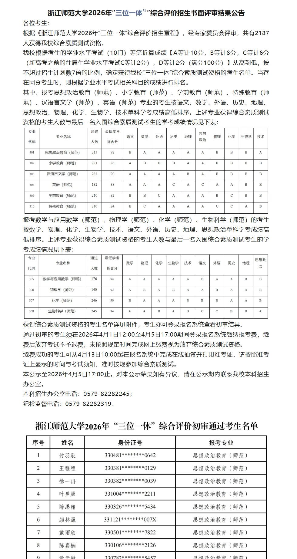 一、2026 年浙江师范大学三位一体初审结果最新安排