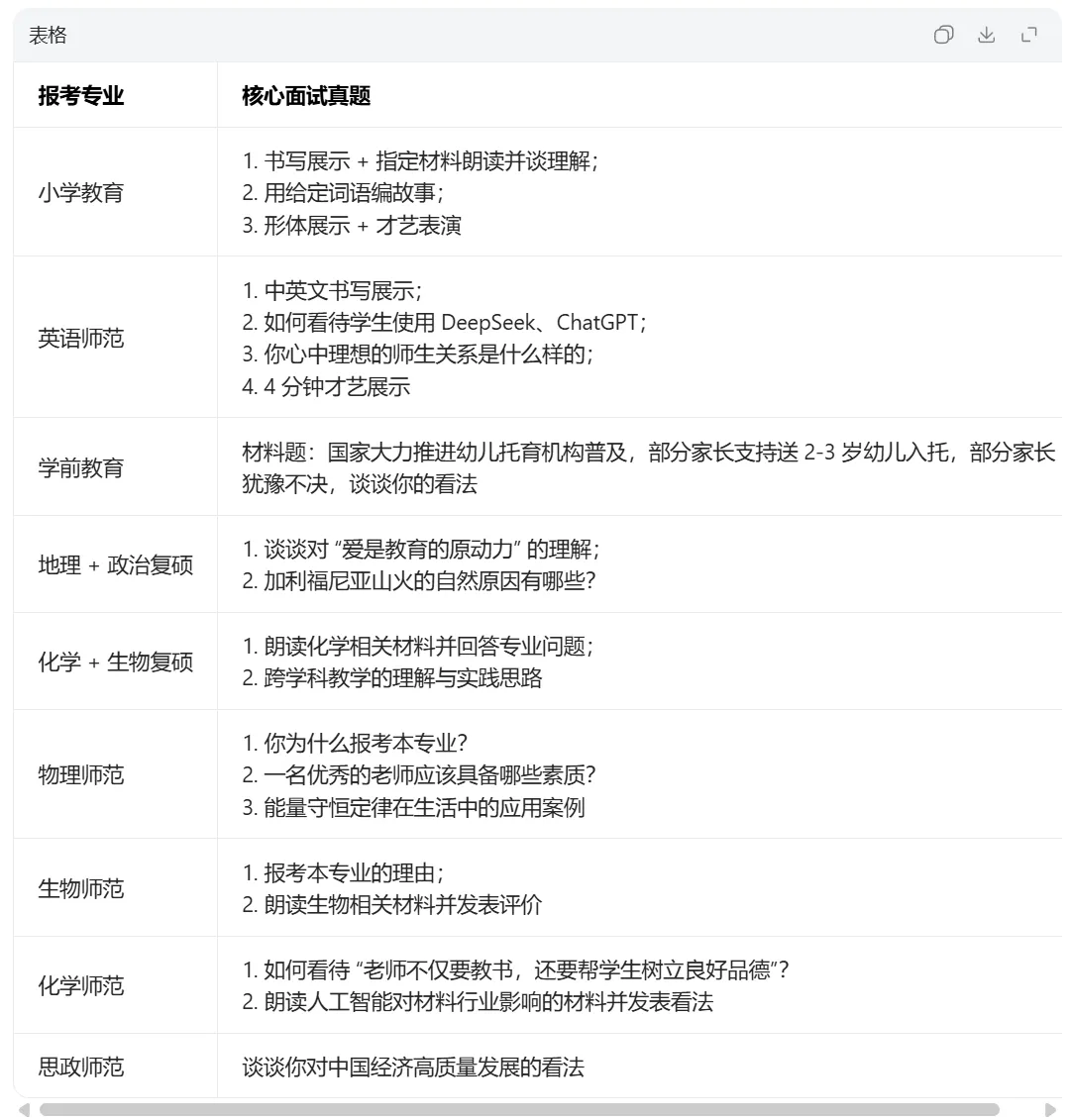 纯面试考核:其余师范类、复硕试点专业,核心考核模块包含书写展示、材料朗读与理解、结构化问答、专业学科素养问答、才艺 / 形体展示五大类,其中学前教育、特殊教育专业不设书写展示,非数理专业大多要求才艺展示;