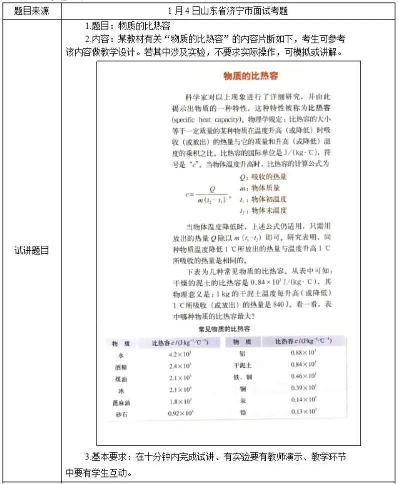 教师出示例题:质量为2kg的某种物质温度从20℃升高到40℃时,吸收的热量是1.88×104J,该物质的比热容是多少?