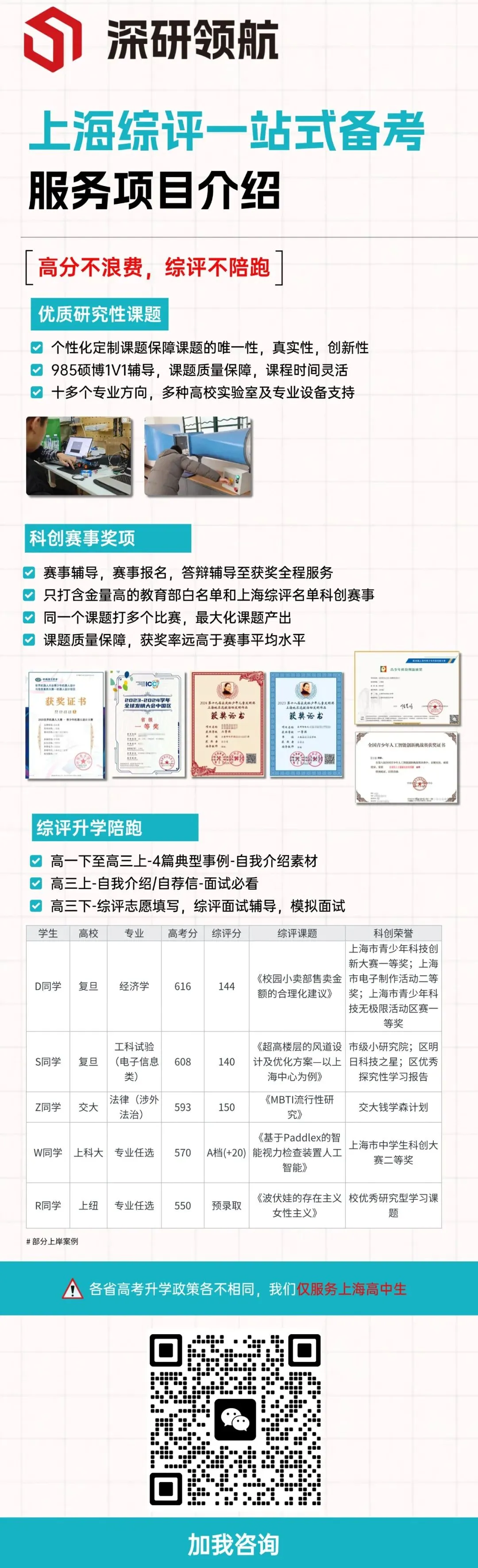 关于研究性课题: 这是面试必不可少的环节。从选题、开题、研究、分析到成文,每一步都要非常清楚。高校老师特别喜欢深挖课题细节,借此考察学生的参与度和学术潜力。