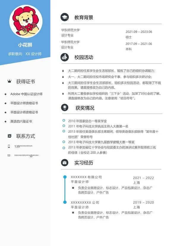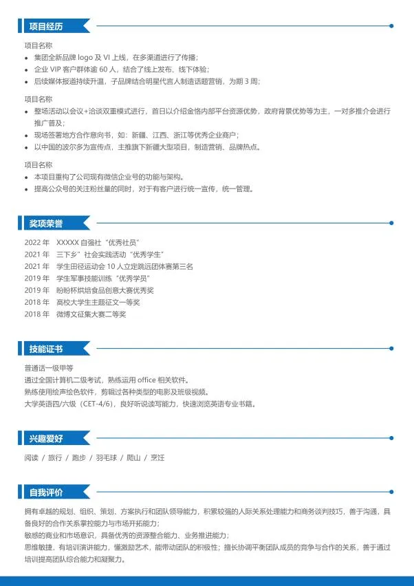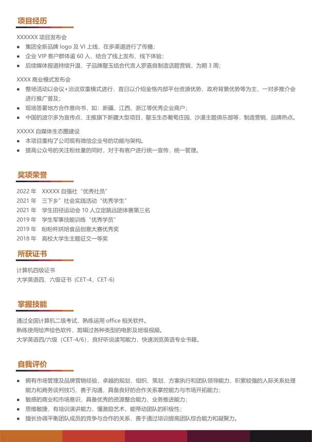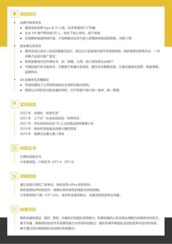 在单页的基础上补充了校园实践、项目经历、自我评价等栏目