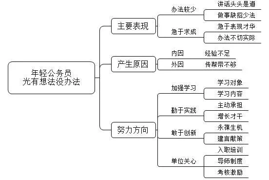 第一,光有想法没办法,主要表现为:一方面,办法较少。很多年轻公务员平时往往讲话头头是道,但是在遇到难题时往往缺招少法、束手无策。另一方面,做事急于求成,一些年轻公务员进入单位后急于表现自己的学识和才华,在对现实问题的矛盾点、复杂情况还未充分吃透的情况下,提出很多标新立异的解决办法,不乏空中楼阁的意味。