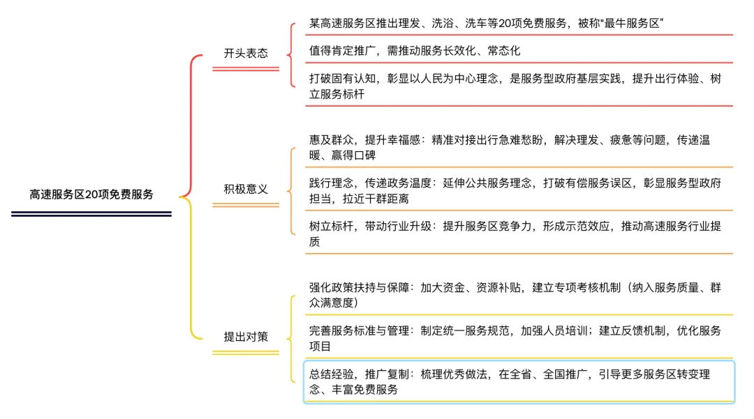 各位考官,某高速服务区推出理发、洗浴、洗车等20项免费服务,被司机称赞为“最牛服务区”,这一现象令人暖心,也值得肯定与推广。它不仅打破了大众对高速服务区“只提供基础补给、以盈利为导向”的固有认知,更彰显了以人民为中心的服务理念,是服务型政府建设在基层服务场景的生动实践,既提升了群众出行体验,也树立了公共服务的良好标杆,但也需多措并举,推动这种优质服务长效化、常态化。