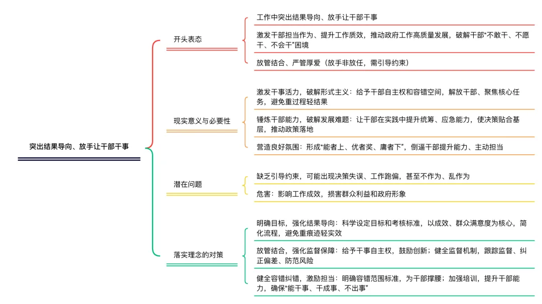 各位考官,工作中突出结果导向、放手让干部干事,是激发干部担当作为、提升工作质效的关键举措,更是推动政府工作高质量发展的必然要求。这一理念既明确了“以结果论成效”的工作标准,也给予了干部干事创业的空间和信任,破解了部分干部“不敢干、不愿干、不会干”的困境,彰显了科学的管理理念和务实的工作作风,对新时代政府工作提质增效、锻造高素质干部队伍具有重要意义。