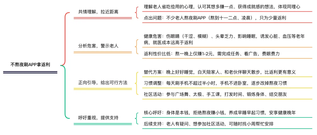 一些手机APP存在根据在线时长返利,老年人因为返利熬夜看手机的问题,假如你是社区工作人员,针对此类现象,你该如何劝导他们?请现场模拟