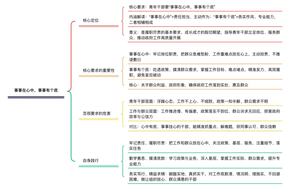 各位考官,“青年干部要事事在心中,事事有个底”,这句话简洁有力、内涵深刻,是对青年干部履职尽责的基本要求,更是对青年干部成长成才的殷切期望。“事事在心中”体现的是责任担当与主动作为,“事事有个底”彰显的是务实作风与专业能力,二者相辅相成、缺一不可,对青年干部立足岗位、服务群众,推动政府工作高质量开展,具有十分重要的指导意义。