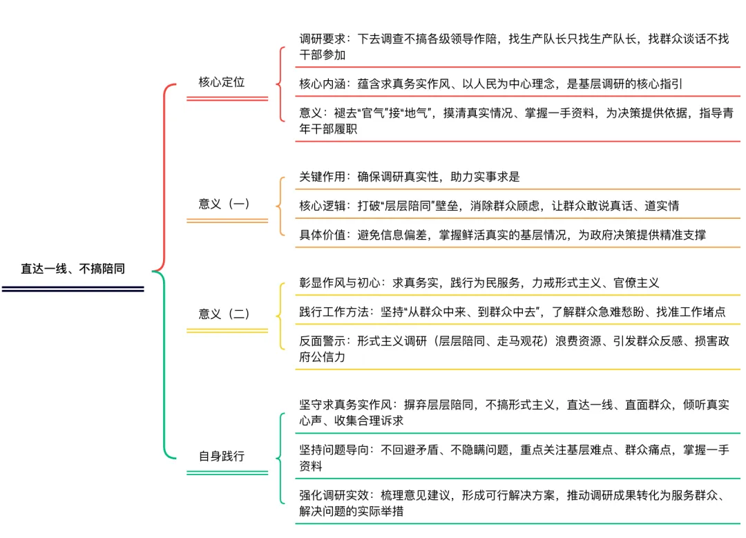 各位考官,题干中“下去调查不搞各级领导作陪,找生产队长只找生产队长,找群众谈话不找干部参加”的要求,看似是调查方式的细节规定,实则蕴含着求真务实的工作作风、以人民为中心的工作理念,更是对基层调研工作的核心指引。这句话启示我们,政府工作中的调研,唯有褪去“官气”、多接“地气”,直达基层、直面群众,才能摸清真实情况、掌握第一手资料,为决策提供科学依据,这对新时代青年干部做好基层工作、践行履职使命,具有十分重要的指导意义。