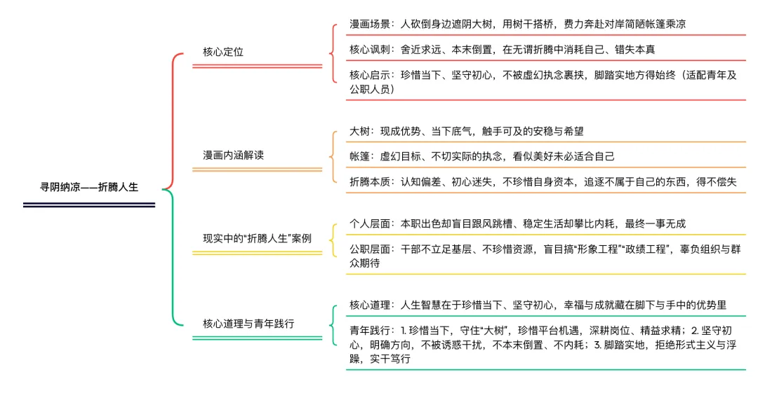 各位考官,大家好!今天,我想结合《寻阴纳凉——折腾人生》这幅漫画,和大家分享一段关于人生选择的感悟。漫画中,河的两岸,一边有枝繁叶茂的大树,可遮阴纳凉;一边有简陋的帐篷,看似能躲避酷暑。而画中的人,却亲手砍倒了身边的大树,用树干当作桥梁,费力奔赴对岸的帐篷乘凉。这幅漫画,生动讽刺了那些舍近求远、本末倒置,在无谓的折腾中消耗自己、错失本真的人,更给我们每一个人,尤其是即将投身工作的青年,带来了深刻的启示。