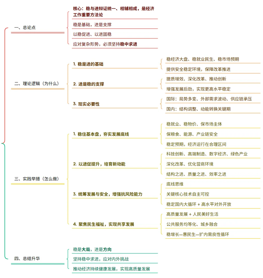 “稳”重点是稳住经济大盘、稳住就业民生、稳住市场预期,为改革发展创造安全稳定的环境,没有稳定的大局,转型升级就难以推进。“进”则是在稳的前提下提质增效、深化改革、推动创新,只有不断进取,才能增强发展后劲,实现更高水平的稳定。只稳不进容易陷入停滞,只进不稳容易引发风险,必须以稳促进、以进固稳。