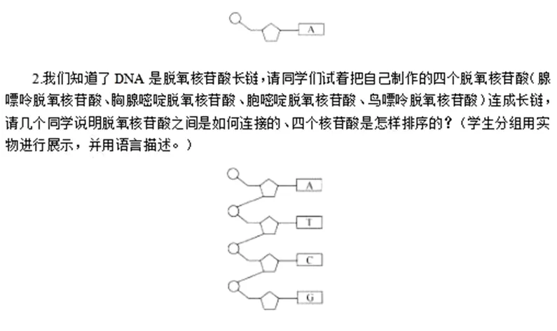 1.DNA分子的组成单位是什么?(脱氧核苷酸。)请用课前准备好的材料展现出来。
