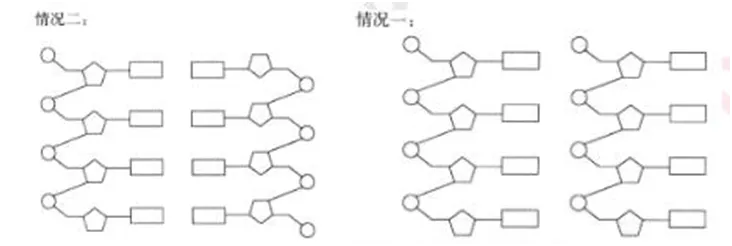 4.脱氧核苷酸单链是无法稳定存在的,那么由这样的长链组成的DNA分子要具有怎样的结构才能稳定存在并且遗传给后代呢?请结合教材,尝试构建DNA双链结构。(备注:预设有两种情况,见下图,设置纠错环节。)
