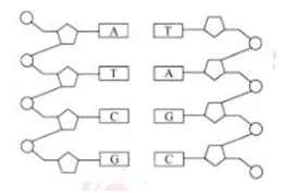 5.1952年春天,奥地利的生物化学家査戈夫访问了剑桥大学,沃森和克里克从他那里得到了一个重要的信息:A(腺嘌呤)的量等于T(胸腺嘧啶)的量,G(鸟嘌呤)的量等于C(胞嘧啶)的量,这给了沃森和克里克很大的启示,同学们,你们获得了什么启发吗?(得出下图,碱基间有固定的配对方式:一条链中的A与另一条链上的T配对,G与C配对。)请组内讨论,然后修正本组的模型。