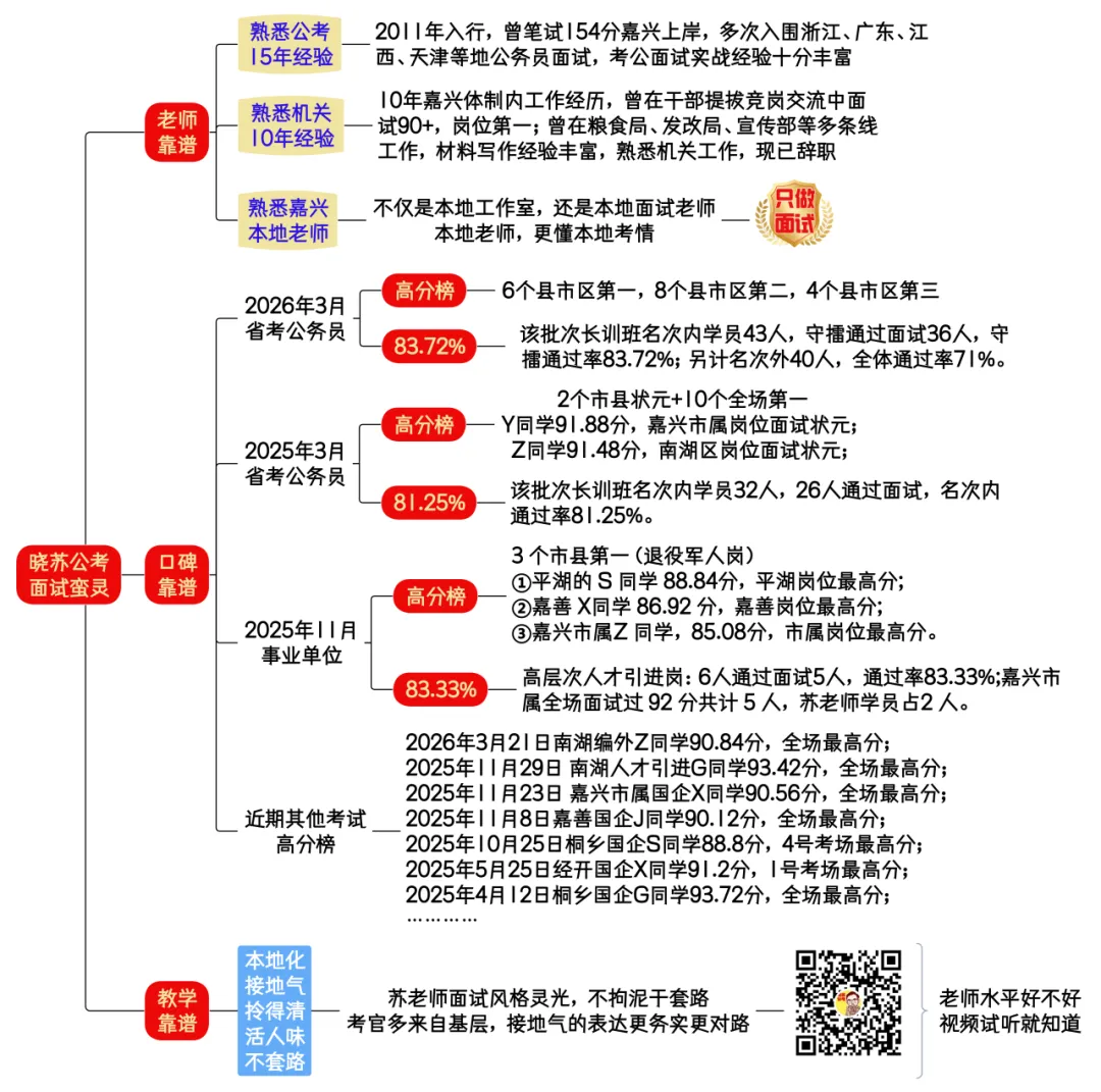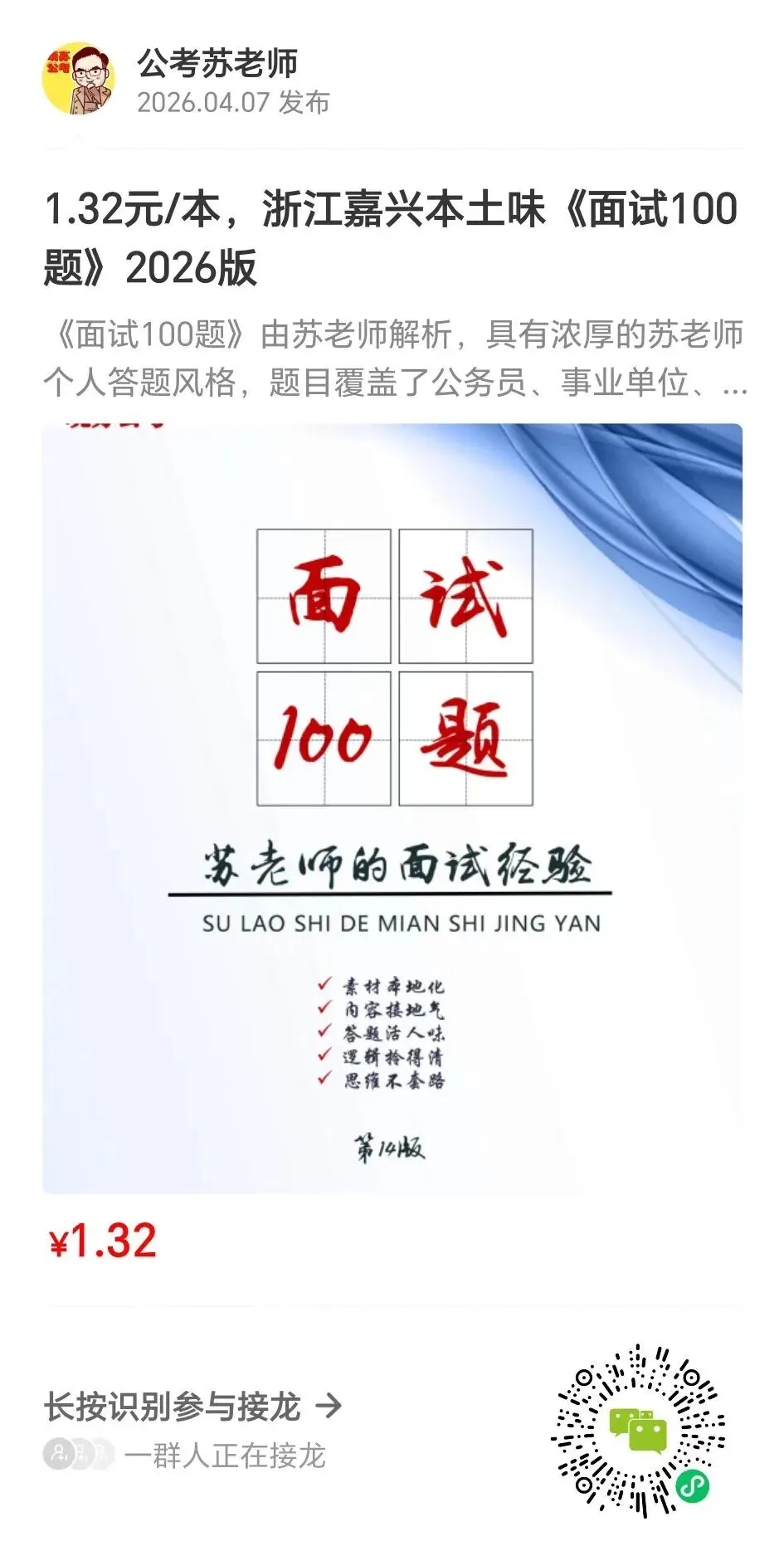 《面试100题》由苏老师解析,具有浓厚的苏老师个人答题风格,题目覆盖了公务员、事业单位、国企、社区干部等公职考试,每道题目解析文字写的比较多,很多同学在考场上是讲不出这么多内容来的,之所以写这么多文字,是为了供大家参考学习,先把知识要点学厚,等自己有了理解和积累以后,再把知识学薄。看到题目的时候要去想从哪几个角度答题?每个角度该如何展开?再回过头来看一看苏老师的解析是如何谋篇布局的,有哪些浙江的、嘉兴的本地素材可以积累背诵?面试想拿高分我认为要做好三个基础要点,一是逻辑结构拎得清,多用段旨句,提炼关键字;二是内容言之有物,问什么答什么不偏题,谈自己感受有活人味;三是外形自信有感染力,答题的样子要好,落落大方,得要有个干部的样子。