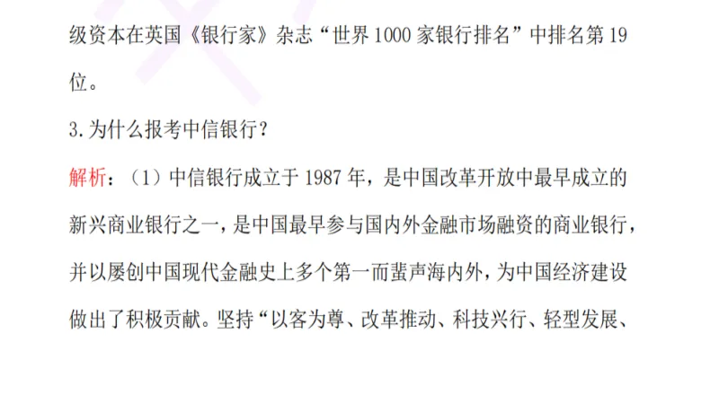 2026年中信银行春招笔试已经进行了,面试很快就会开始,中信银行面试主要是半结构化+无领导小组+对抗赛+演讲;历年中信银行面试真题+解析,都是十四年以上面试经验的李老师亲自解析;视频也录制到位,半结构化面试+无领导小组面试+对抗赛+演讲,包含自我介绍、求职动机、时政热点、人际关系、无领导小组、对抗赛、演讲等常考题型,当然除去视频以外,还有讲义和经济金融面试热点话题。要李老师视频的同学,可以有答疑和修改自我介绍,都是李老师负责;单要真题,没有这个福利!寻求免费的同学勿扰!