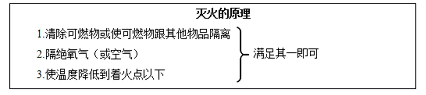 【师生总结】灭火实际就是破坏燃烧的条件。根据燃烧的条件,可以归纳出灭火的原理:1.清除可燃物或使可燃物跟其他物品隔离;2.隔绝氧气(或空气);3.使温度降低到着火点以下。三者破坏其一就可灭火,也可同时破坏。