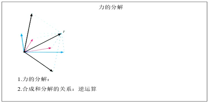 2.引导学生:在找到合力的两个分力的过程,即为力的分解,而等效的两个力即为合力的分力。明确了力的分解的概念之后,再学生根据概念将耙所受的绳的拉力进行力的分解,并引导学生使用平行四边形定则和三角形法则进行分解,加深其理解。