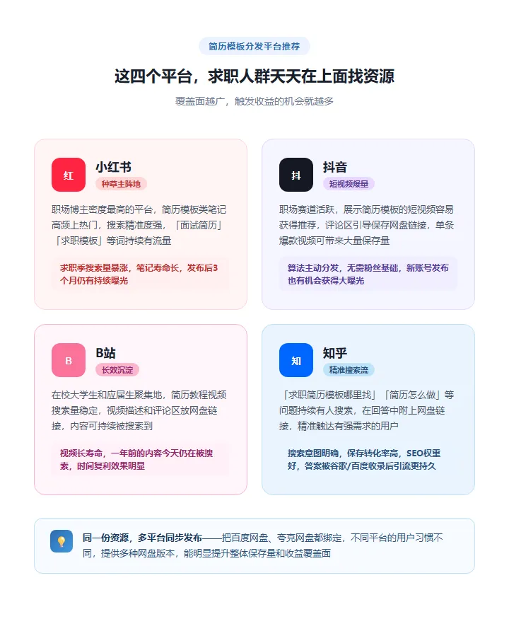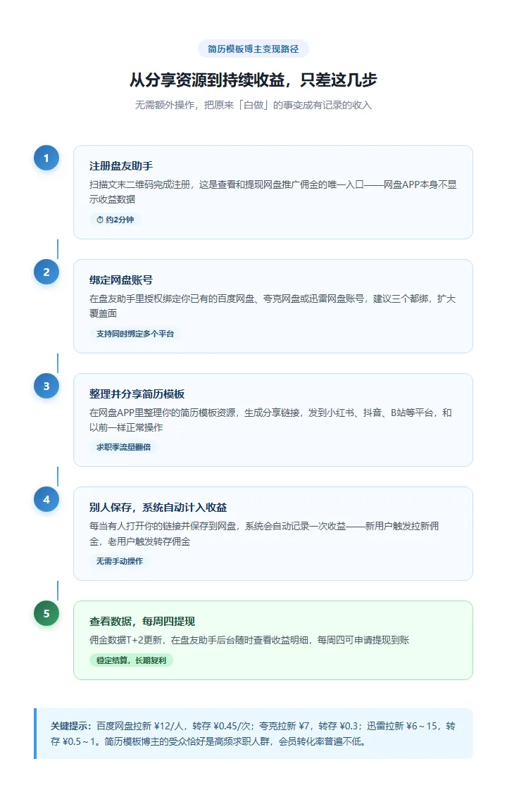 底下的评论一半是「谢谢博主」,另一半是「链接失效了」但你从来没想过,这个「保存」的动作,可以给你额外结一笔钱逻辑很简单:帮网盘平台带来新用户,或者让更多人把文件保存到他们的网盘,平台就付你佣金一种叫转存收益——对方已经有网盘账号,点开你的链接保存了一次,百度网盘这边结¥0.45,夸克¥0.3,迅雷¥0.5~1另一种叫拉新收益——对方没有这个网盘账号,通过你的链接注册了,还有一种叫会员分佣——对方通过你的链接买了网盘会员,分享简历模板的人,受众大多是刚毕业的学生或者跳槽中的职场人,四、 简历模板这个细分领域,为什么特别适合做这件事不是爆款也没关系,时间复利会慢慢帮你把这些积累的保存量变成佣金第三步,继续在百度网盘里整理你的简历模板,分享链接,发出去,第四步,别人保存之后,佣金数据会在T+2更新,每周四可以提现必须通过盘友助手才能看到佣金数据,这是唯一的查看入口只是一个顺手的动作——你本来就在发内容,多绑一个账号只需要几分钟每一份模板、每一条链接,都能在很长时间内持续给你带回来一些东西,注册后,在「盘友助手」公众号后台回复【教程】领取完整推广教程