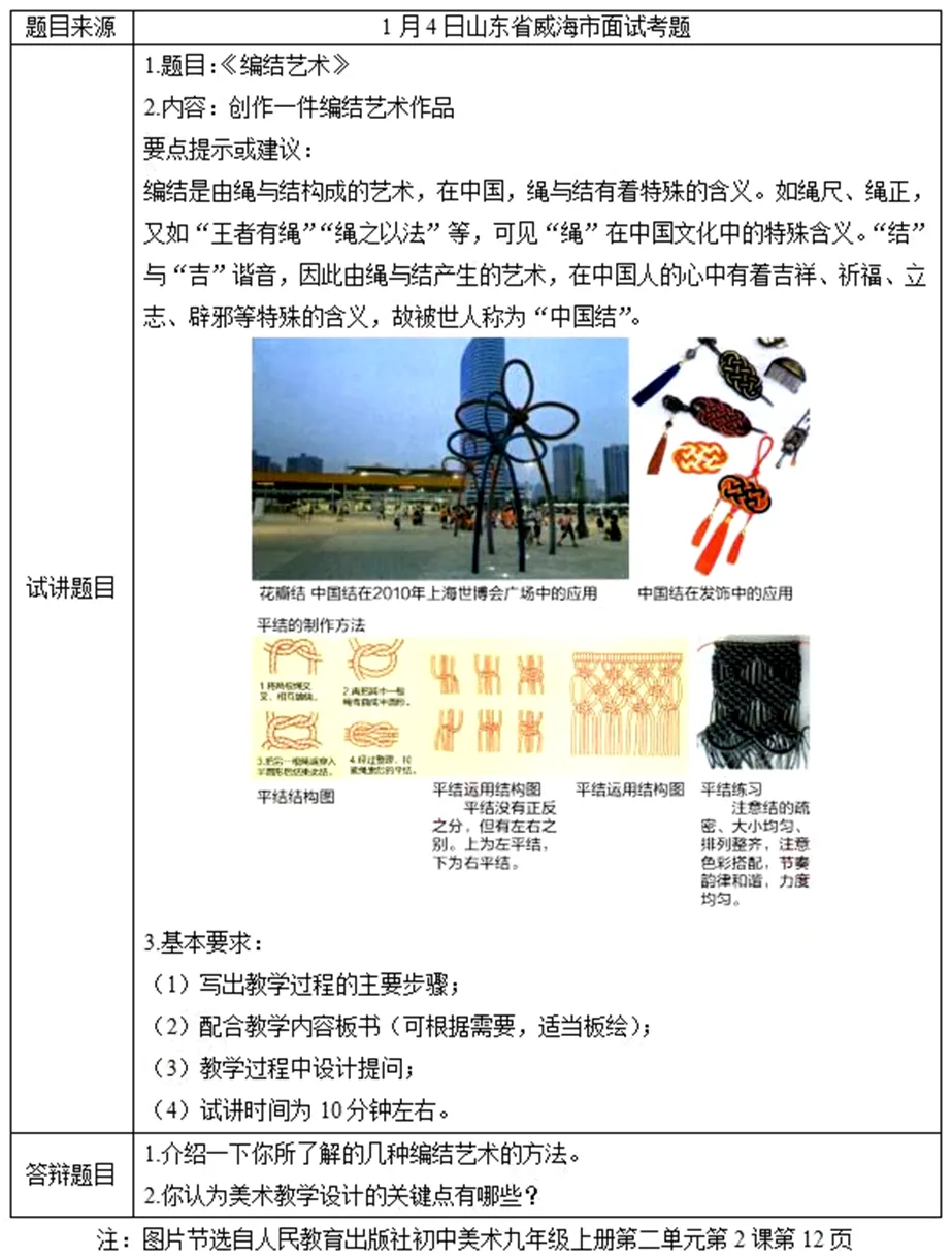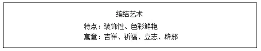 学生交流后并回答,教师总结:编结,是由绳与结共同构成的艺术,绳与结在中国有特殊的含义,比如“绳之以法”,“结”与“吉”谐音,因此编结在中国有吉祥、祈福、立志、辟邪等含义。