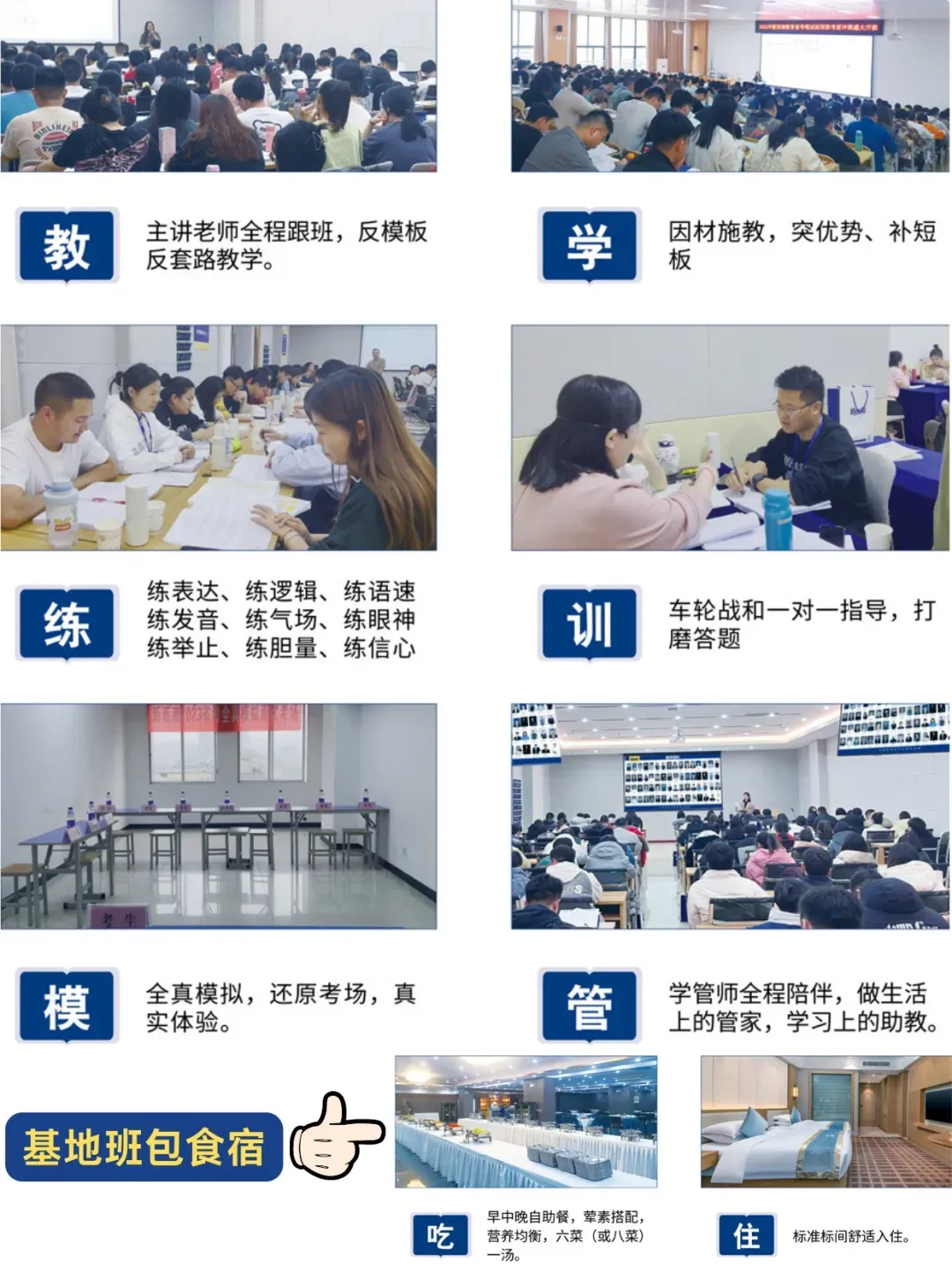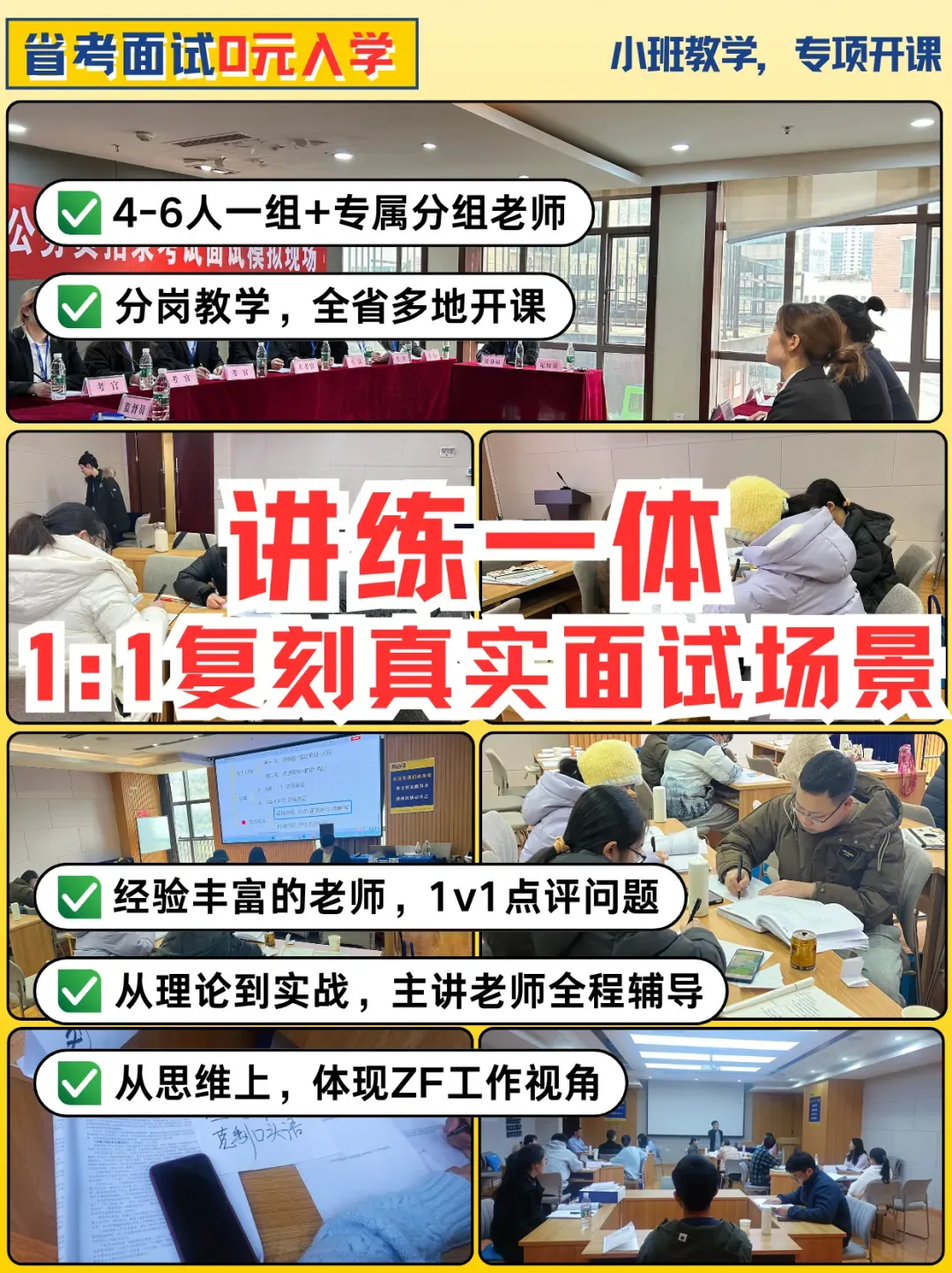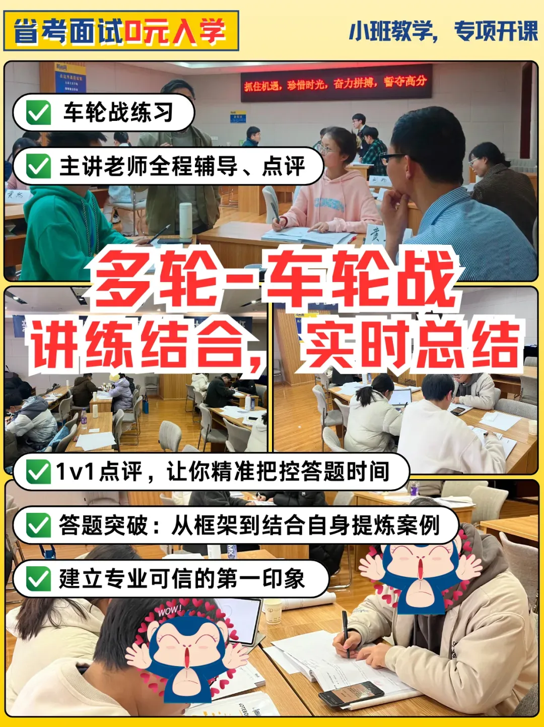 6-8人一组,主讲老师全程辅导、点评、车轮实战练习提升(1)一对一精准纠偏:根据学员个人特质与薄弱环节,量身定制改进方案,帮助学员在短时间内迅速掌握核心要点;(2)反模板教学:帮助学员形成独特且贴合自身的答题风格 ;(3)心理辅导:及时关注学员上课状态,帮助学员克服紧张情绪,心理咨询,展现自信从容面试状态。