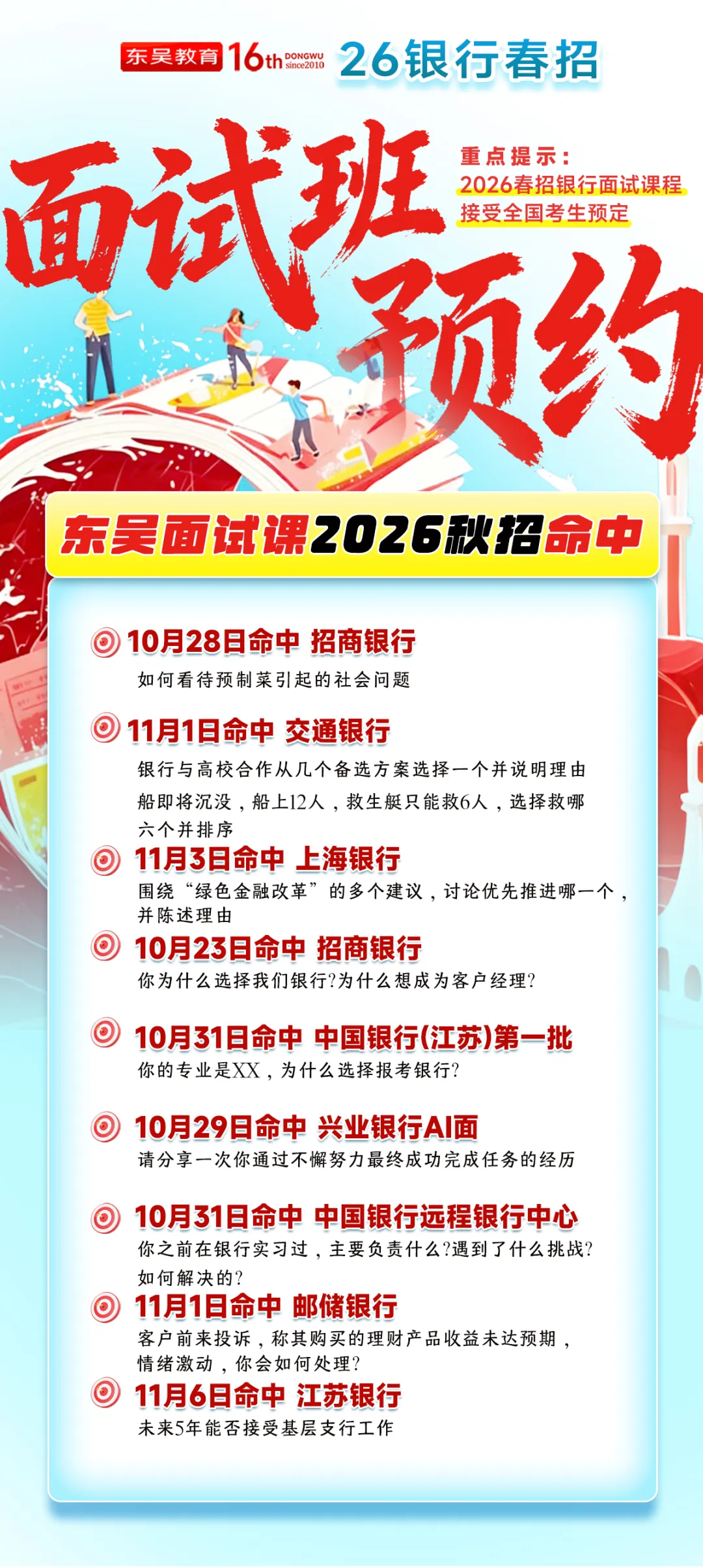 在刚刚结束的2026银行秋招中,东吴教育面试课程精准命中多家银行面试真题,帮助众多学员顺利通关。以下为部分命中案例: