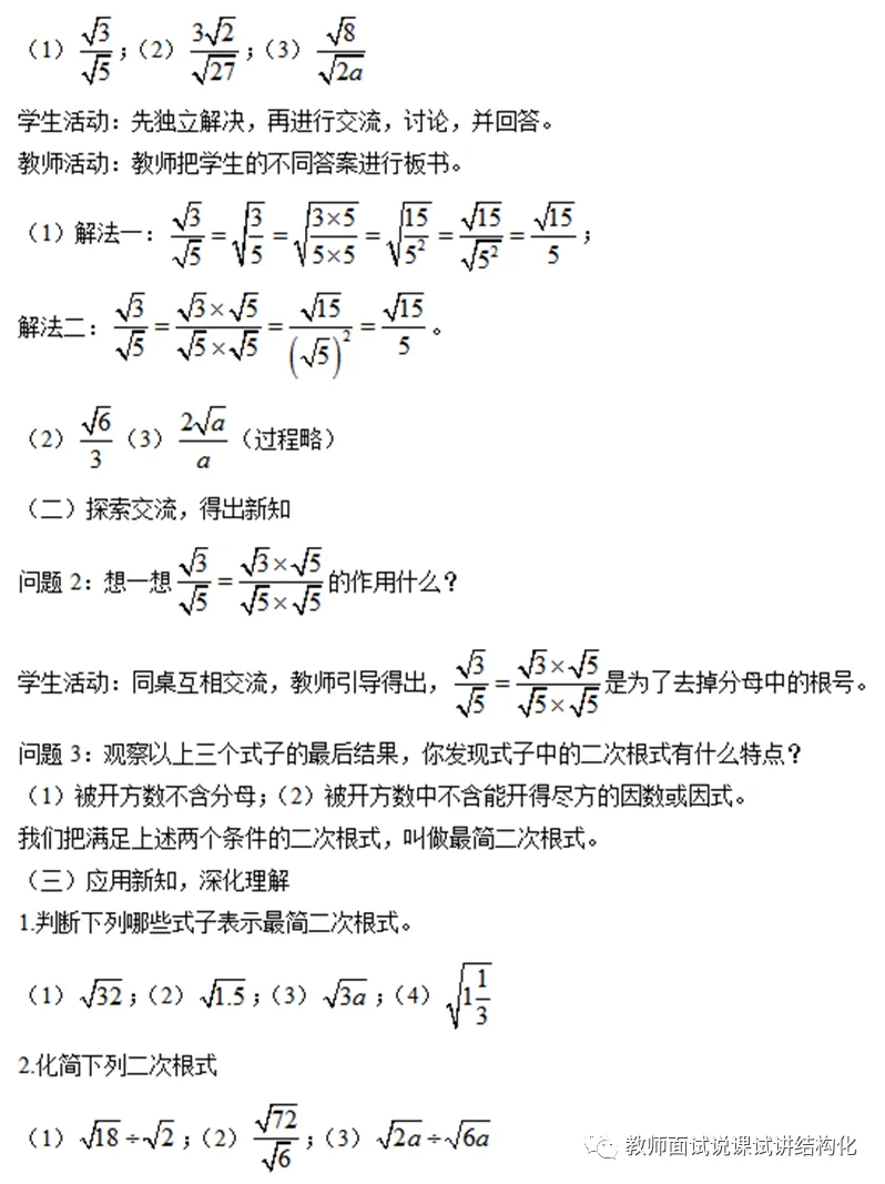 初中数学面试《二次根式的化简》题目+教案+试讲稿+答辩